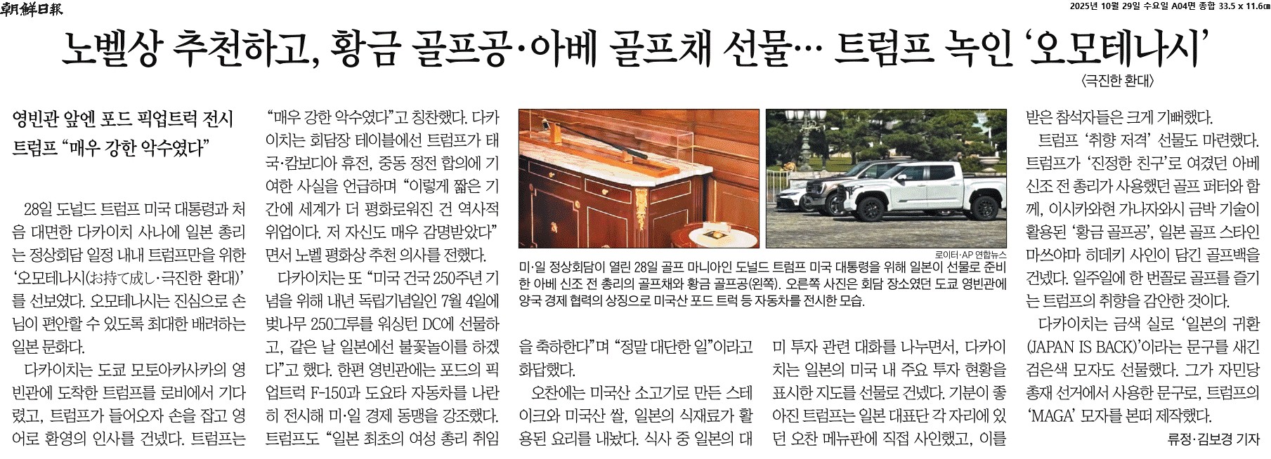 ① 28일 도널드 트럼프 미국 대통령과 처음 대면한 다카이치 사나에 일본 총리는 정상회담 일정 내내 트럼프만을 위한 ‘오모테나시(お持て成し·극진한 환대)‘를 선보였다. 오모테나시는 진심으로 손님이 편안할 수 있도록 최대한 배려하는 일본 문화다.