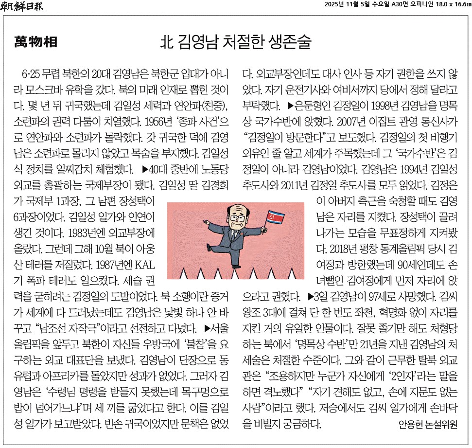 ⑤ 3일 김영남이 97세로 사망했다. 김씨 왕조 3대에 걸쳐 단 한 번도 좌천, 혁명화 없이 자리를 지킨 거의 유일한 인물이다. 잘못 졸기만 해도 처형당하는 북에서 ‘명목상 수반’만 21년을 지낸 김영남의 처세술은 처절한 수준이다. 그와 같이 근무한 탈북 외교관은 “조용하지만 누군가 자신에게 ‘2인자’라는 말을 하면 격노했다” “자기 견해도 없고, 손에 지문도 없는 사람”이라고 했다.