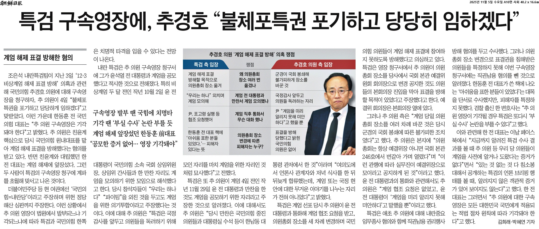 ⑤ 이와 관련해 한 전 대표는 이날 페이스북에서 “지금까지 알려진 특검 수사 결과를 볼 때 추 의원 등 우리 당 의원들이 계엄을 사전에 알거나 도왔다는 증거가 없다”면서 “있는 것 없는 것 다 침소봉대해서 공개하는 특검의 언론 브리핑 행태를 볼 때, 알려지지 않은 객관적 증거가 있어 보이지도 않는다”고 했다. 한 전 대표는 그러면서 “추 의원에 대한 구속영장은 모든 대한민국 국민에게 적용되는 적법 절차 원칙에 따라 기각돼야 한다”고 했다.