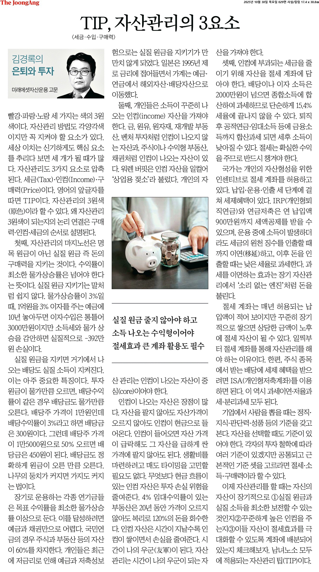 ① 빨강·파랑·노랑 세 가지는 색의 3원색이다. 자산관리 방법도 각양각색이지만 꼭 지켜야 할 요소가 있다. 세상 이치는 신기하게도 핵심 요소를 추리다 보면 세 개가 될 때가 많다. 자산관리도 3가지 요소로 압축된다. 세금(Tax)·인컴(Income)·구매력(Price)이다. 영어의 앞글자를 따면 TIP이다. 자산관리의 3원색(原色)이라 할 수 있다. 왜 자산관리 3원색이 되는지의 논리 연결은 구매력·인컴·세금의 순서로 설명된다.