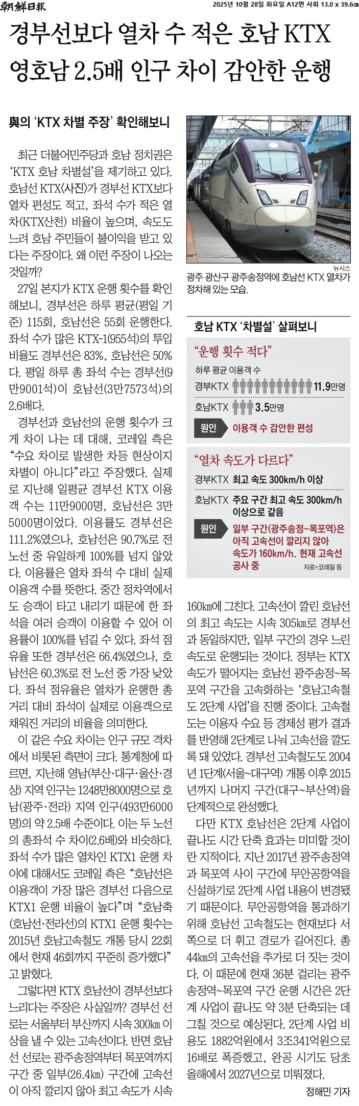 ① 최근 더불어민주당과 호남 정치권은 ‘KTX 호남 차별설’을 제기하고 있다. 호남선 KTX가 경부선 KTX보다 열차 편성도 적고, 좌석 수가 적은 열차(KTX산천) 비율이 높으며, 속도도 느려 호남 주민들이 불이익을 받고 있다는 주장이다. 왜 이런 주장이 나오는 것일까?