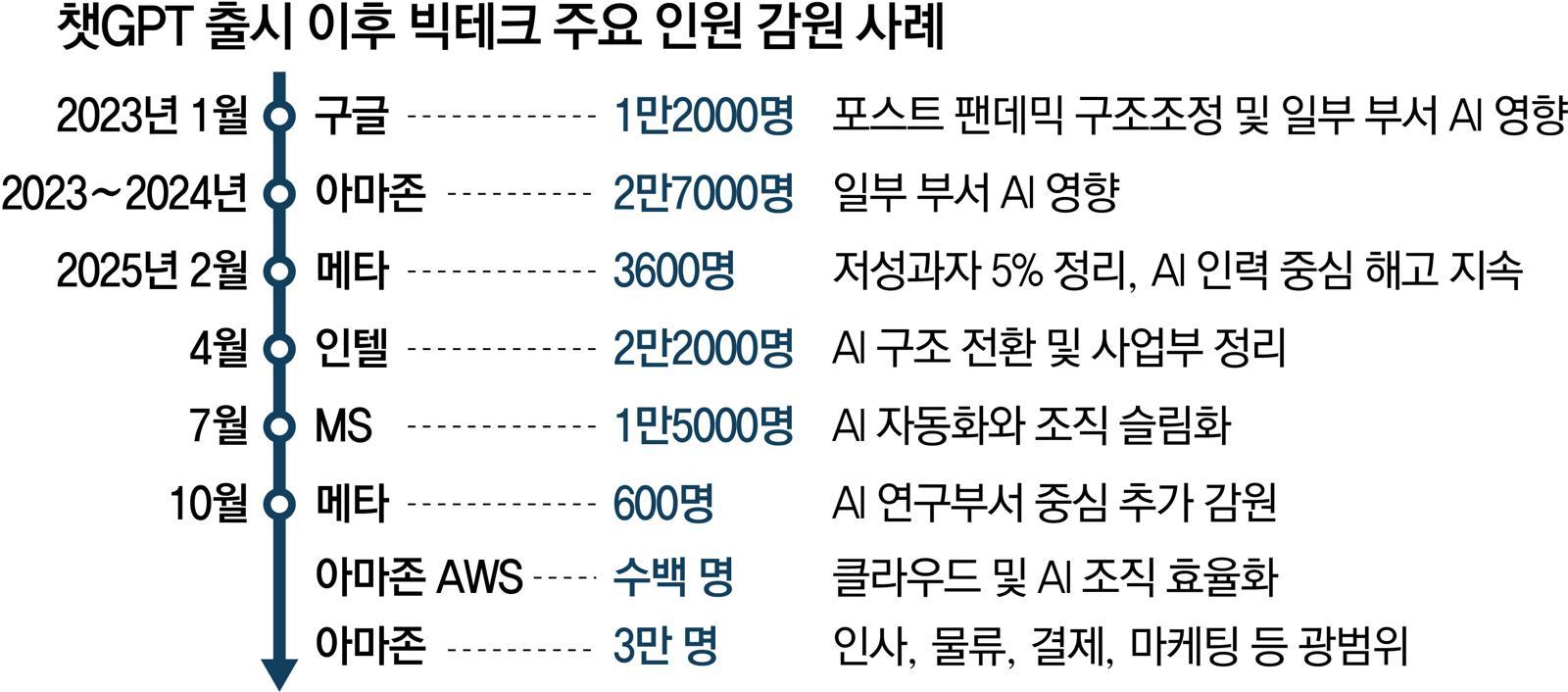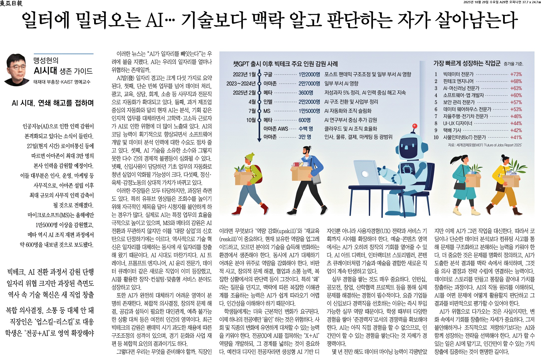 ② 실제로 AI는 특정 업무의 효율을 극적으로 높이고 있으며, MS와 메타의 감원은 AI 전환과 무관하지 않지만 이를 ‘대량 실업’의 신호탄으로 단정하기에는 이르다. 역사적으로 기술 혁신은 일자리를 대체하는 동시에 새 일자리를 창출해 왔기 때문이다. AI 시대도 마찬가지다. AI 트레이너, 프롬프트 엔지니어, AI 윤리 전문가, 데이터 큐레이터 같은 새로운 직업이 이미 등장했고, AI를 활용한 창작·컨설팅·맞춤형 서비스 분야도 성장하고 있다.