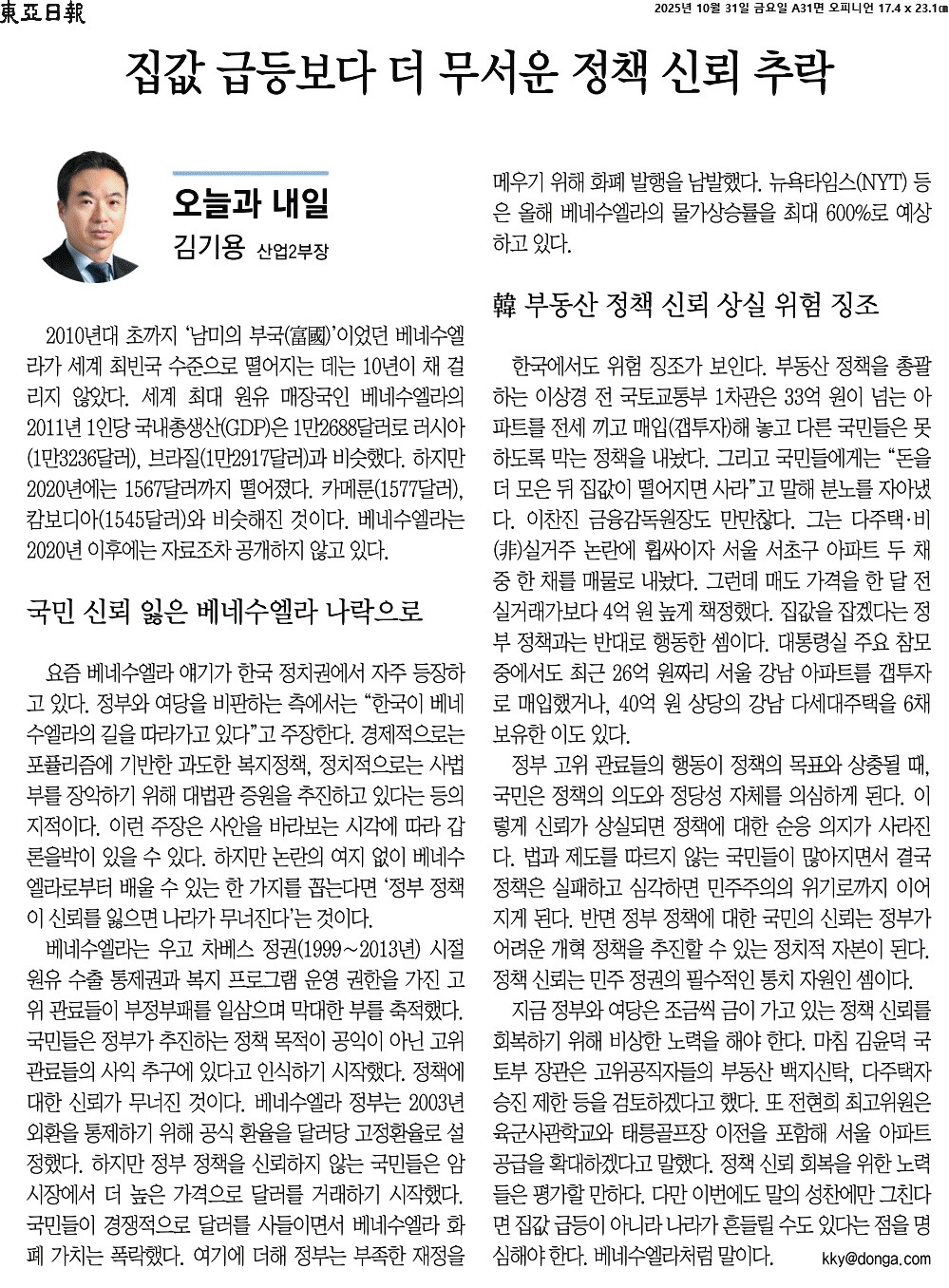 ⑤ 정책 신뢰 회복을 위한 노력들은 평가할 만하다. 다만 이번에도 말의 성찬에만 그친다면 집값 급등이 아니라 나라가 흔들릴 수도 있다는 점을 명심해야 한다. 베네수엘라처럼 말이다.