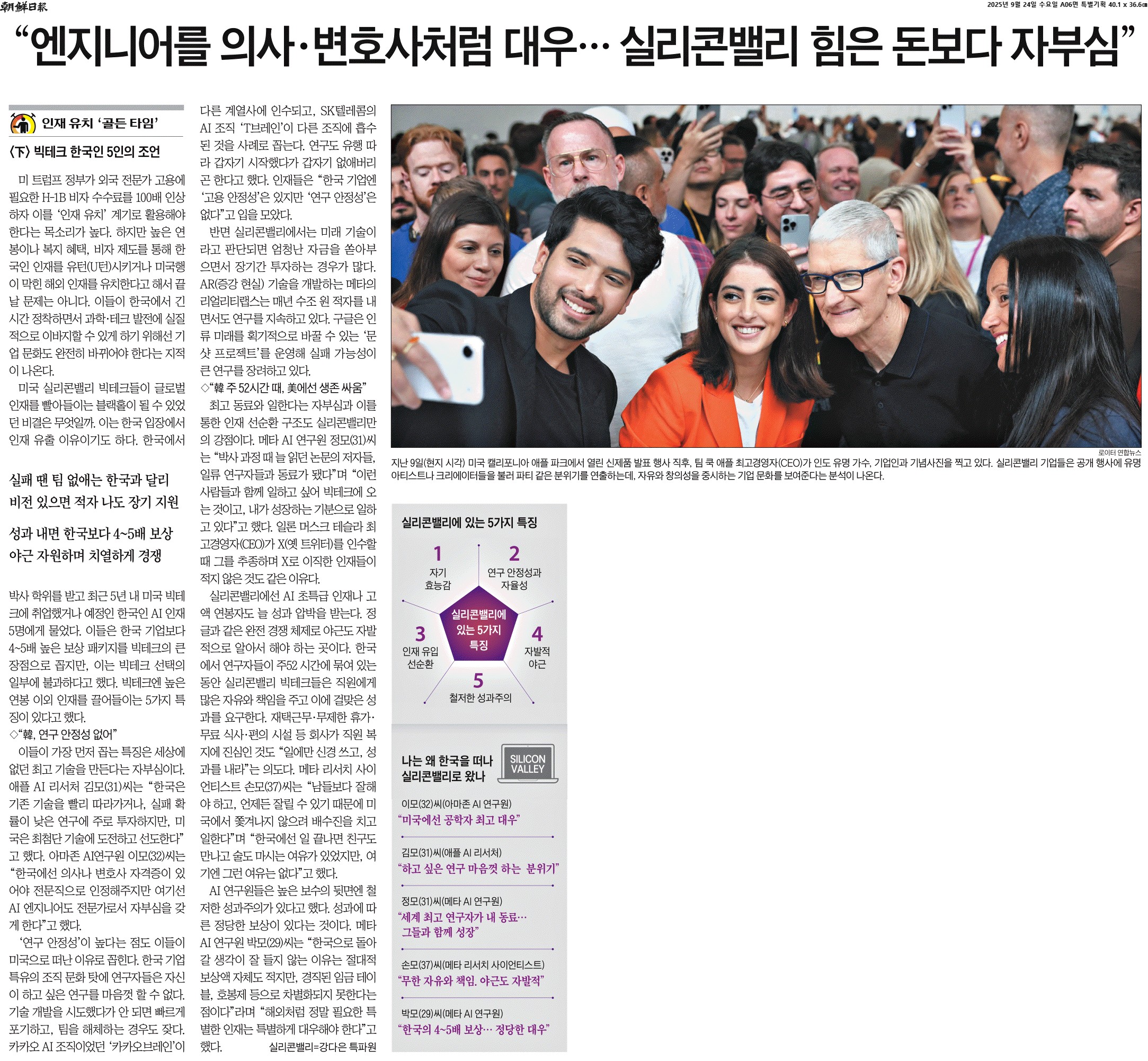 ② 미국 실리콘밸리 빅테크들이 글로벌 인재를 빨아들이는 블랙홀이 될 수 있었던 비결은 무엇일까. 이는 한국 입장에서 인재 유출 이유이기도 하다. 한국에서 박사 학위를 받고 최근 5년 내 미국 빅테크에 취업했거나 예정인 한국인 AI 인재 5명에게 물었다. 이들은 한국 기업보다 4~5배 높은 보상 패키지를 빅테크의 큰 장점으로 꼽지만, 이는 빅테크 선택의 일부에 불과하다고 했다. 빅테크엔 높은 연봉 이외 인재를 끌어들이는 5가지 특징이 있다고 했다.