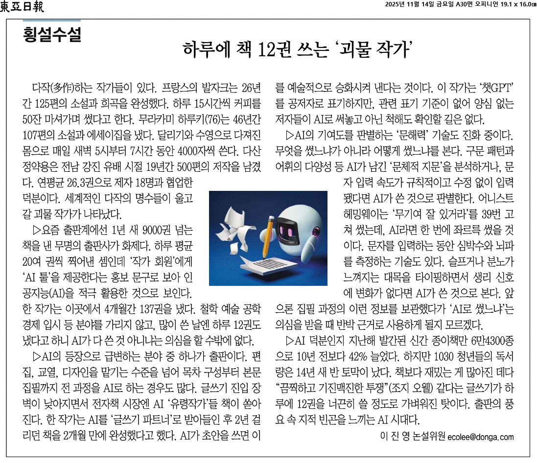 ② 요즘 출판계에선 1년 새 9000권 넘는 책을 낸 무명의 출판사가 화제다. 하루 평균 20여 권씩 찍어낸 셈인데 ‘작가 회원’에게 ‘AI 툴’을 제공한다는 홍보 문구로 보아 인공지능(AI)을 적극 활용한 것으로 보인다. 한 작가는 이곳에서 4개월간 137권을 냈다. 철학 예술 공학 경제 입시 등 분야를 가리지 않고, 많이 쓴 날엔 하루 12권도 냈다고 하니 AI가 다 쓴 것 아니냐는 의심을 할 수밖에 없다.