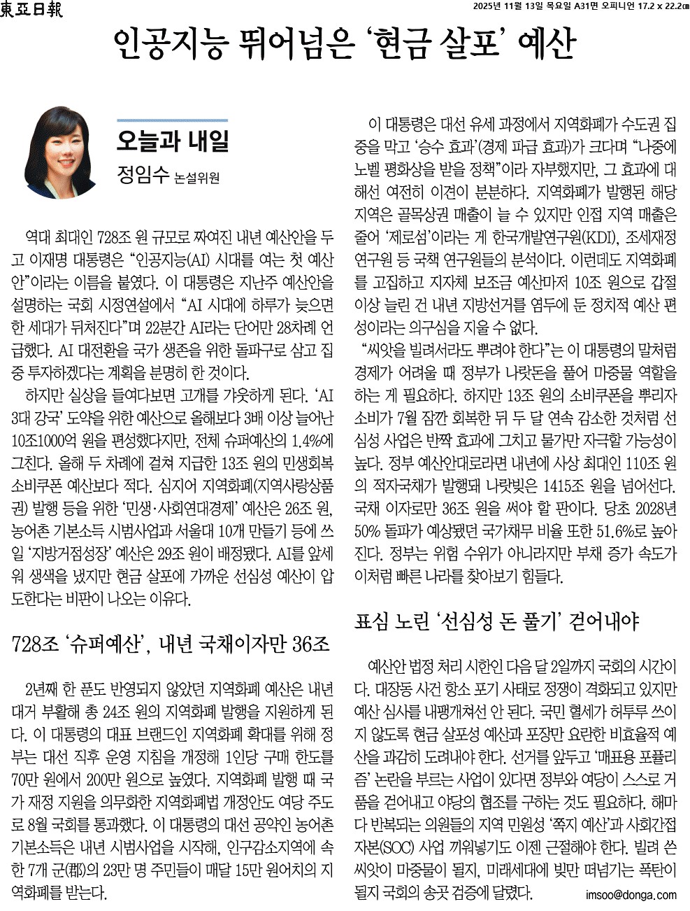 ② 하지만 실상을 들여다보면 고개를 갸웃하게 된다. ‘AI 3대 강국’ 도약을 위한 예산으로 올해보다 3배 이상 늘어난 10조1000억 원을 편성했다지만, 전체 슈퍼예산의 1.4%에 그친다. 올해 두 차례에 걸쳐 지급한 13조 원의 민생회복 소비쿠폰 예산보다 적다. 심지어 지역화폐(지역사랑상품권) 발행 등을 위한 ‘민생·사회연대경제’ 예산은 26조 원, 농어촌 기본소득 시범사업과 서울대 10개 만들기 등에 쓰일 ‘지방거점성장’ 예산은 29조 원이 배정됐다. AI를 앞세워 생색을 냈지만 현금 살포에 가까운 선심성 예산이 압도한다는 비판이 나오는 이유다.