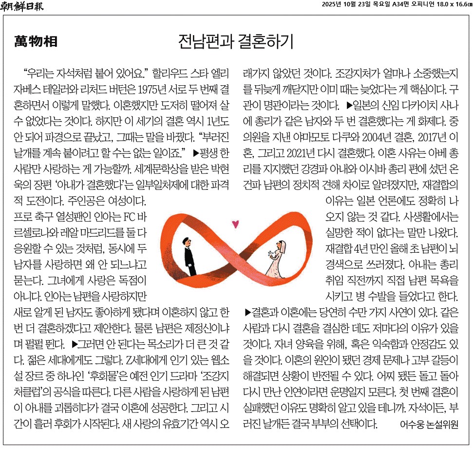 ③ 일본의 신임 다카이치 사나에 총리가 같은 남자와 두 번 결혼했다는 게 화제다. 중의원을 지낸 야마모토 다쿠와 2004년 결혼, 2017년 이혼, 그리고 2021년 다시 결혼했다. 이혼 사유는 아베 총리를 지지했던 강경파 아내와 이시바 총리 편에 섰던 온건파 남편의 정치적 견해 차이로 알려졌지만, 재결합의 이유는 일본 언론에도 정확히 나오지 않는 것 같다.