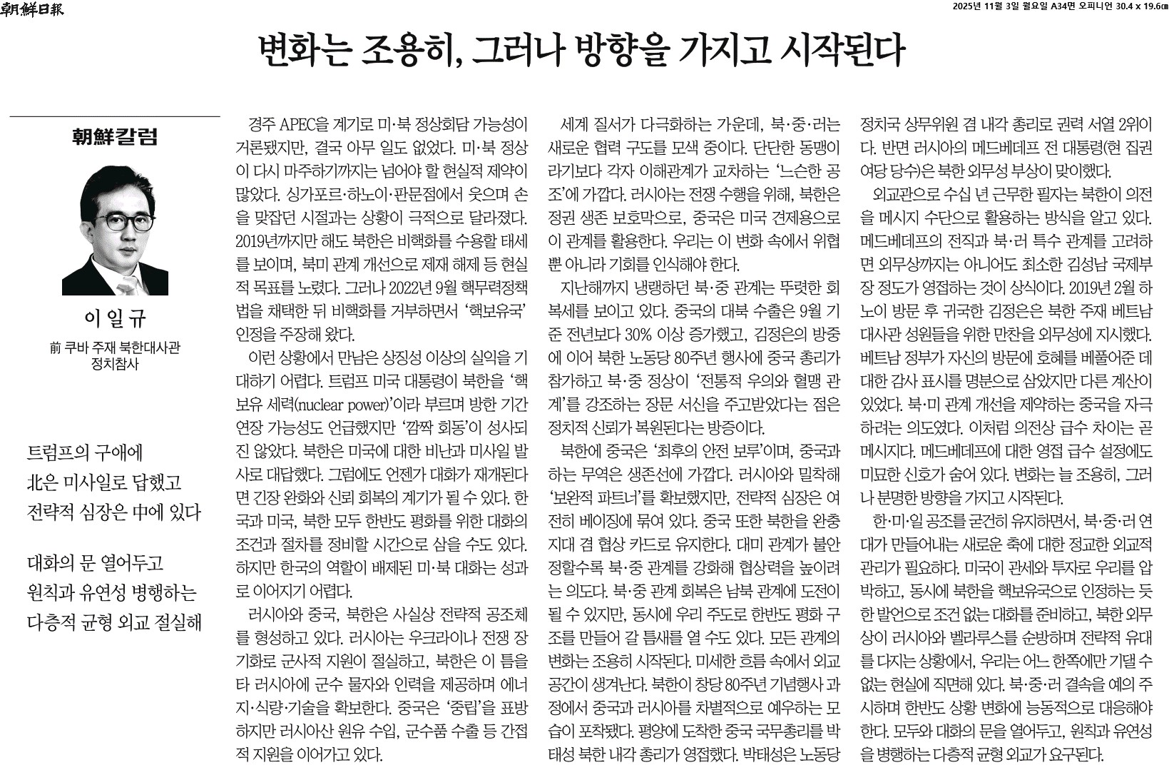 ② 트럼프 미국 대통령이 북한을 ‘핵 보유 세력(nuclear power)’이라 부르며 방한 기간 연장 가능성도 언급했지만 ‘깜짝 회동’이 성사되진 않았다. 북한은 미국에 대한 비난과 미사일 발사로 대답했다. 그럼에도 언젠가 대화가 재개된다면 긴장 완화와 신뢰 회복의 계기가 될 수 있다.