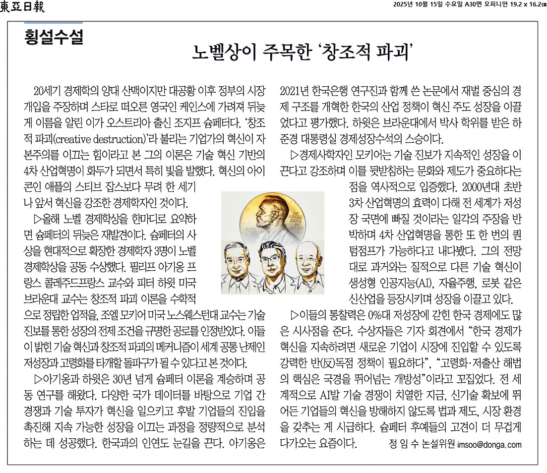 ② 올해 노벨 경제학상을 한마디로 요약하면 슘페터의 뒤늦은 재발견이다. 슘페터의 사상을 현대적으로 확장한 경제학자 3명이 노벨 경제학상을 공동 수상했다.