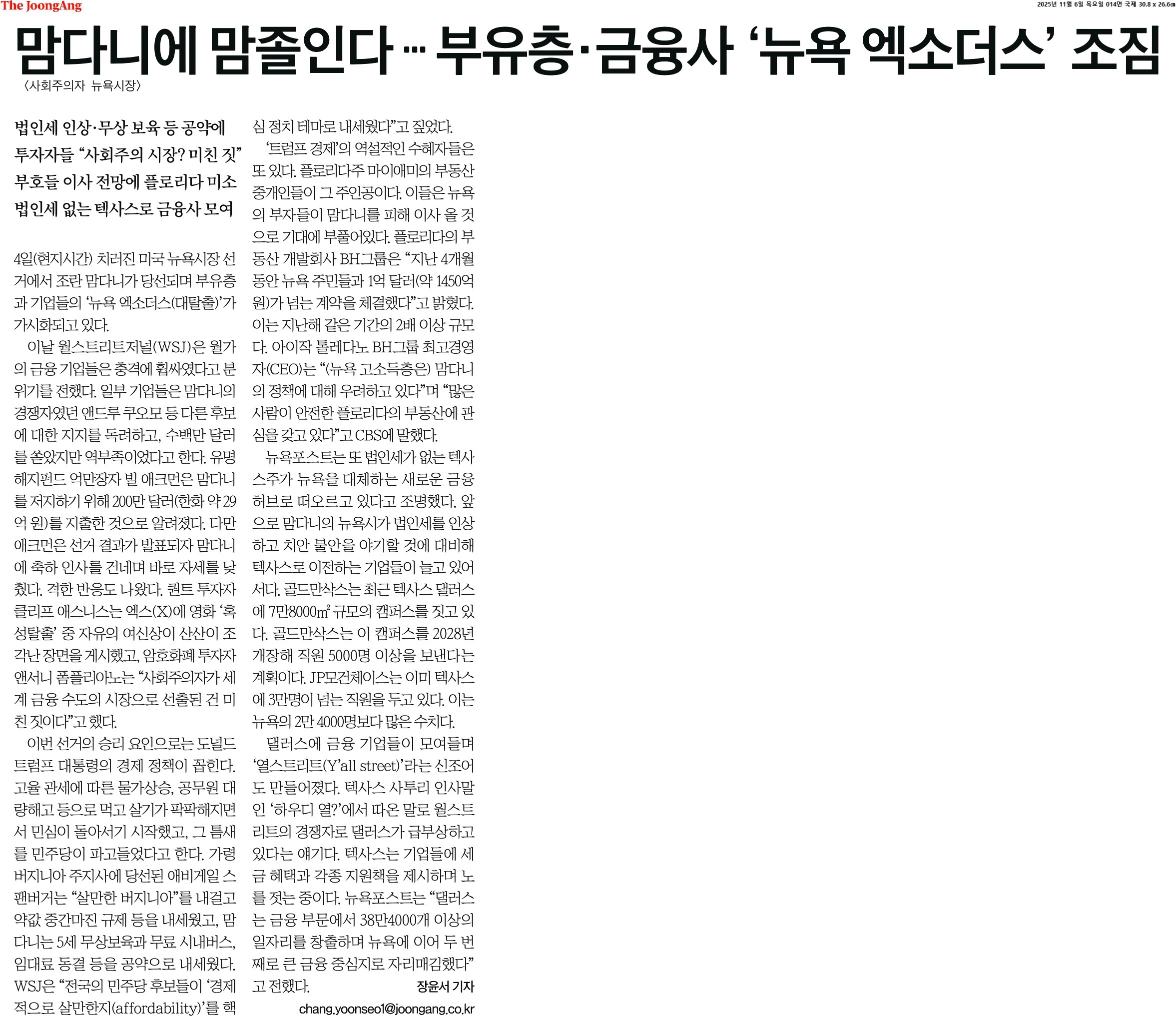 ⑤ 뉴욕포스트는 또 법인세가 없는 텍사스주가 뉴욕을 대체하는 새로운 금융 허브로 떠오르고 있다고 조명했다. 앞으로 맘다니의 뉴욕시가 법인세를 인상하고 치안 불안을 야기할 것에 대비해 텍사스로 이전하는 기업들이 늘고 있어서다.