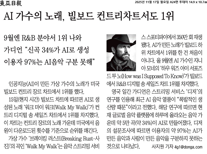 ① 인공지능(AI)이 만든 가상 가수의 노래가 미국 빌보드 컨트리 장르 차트에서 1위를 했다.