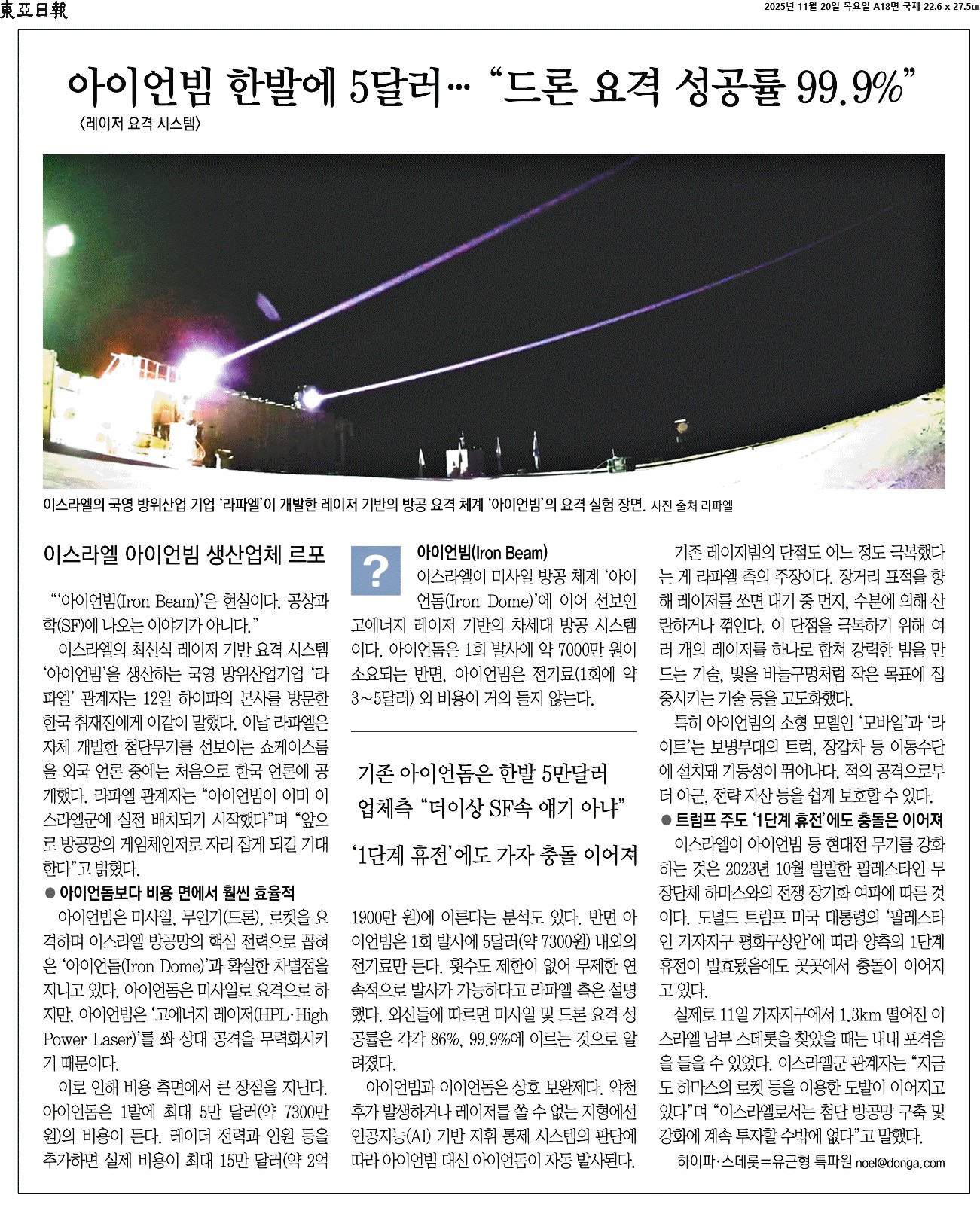 이스라엘의 최신식 레이저 기반 요격 시스템 ‘아이언빔’을 생산하는 국영 방위산업기업 ‘라파엘’ 관계자는 12일 하이파의 본사를 방문한 한국 취재진에게 이같이 말했다.