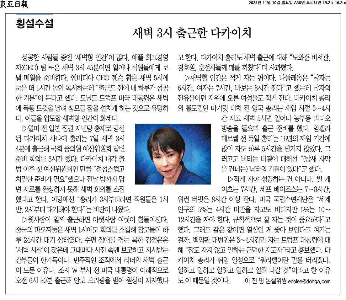 ② 얼마 전 일본 집권 자민당 총재로 당선된 다카이치 사나에 총리는 7일 새벽 3시 4분에 출근해 국회 중의원 예산위원회 답변 준비 회의를 3시간 했다. 다카이치 내각 출범 이후 첫 예산위원회인 만큼 “정성스럽고 치밀한 준비가 필요”했으나 전날 밤까지 답변 자료를 완성하지 못해 새벽 회의를 소집했다고 한다. 야당에선 “총리가 3시부터라면 직원들은 1시 반, 2시부터 대기해야 한다”는 비판이 나왔다.