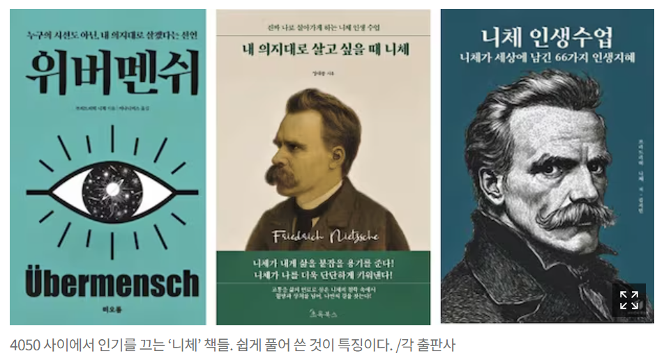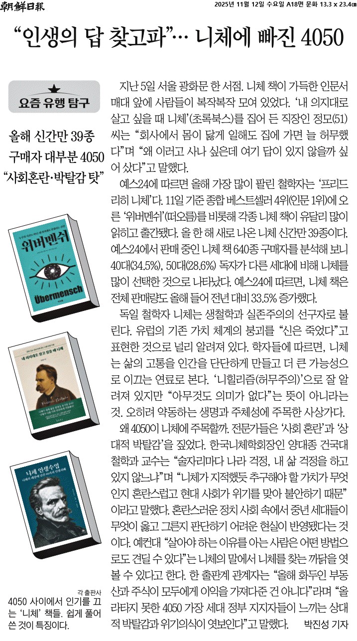 ⑤ 예컨대 “살아야 하는 이유를 아는 사람은 어떤 방법으로도 견딜 수 있다”는 니체의 말에서 니체를 찾는 까닭을 엿볼 수 있다고 한다. 한 출판계 관계자는 “올해 화두인 부동산과 주식이 모두에게 이익을 가져다준 건 아니다”라며 “올라타지 못한 4050 가장 세대 정부 지지자들이 느끼는 상대적 박탈감과 위기의식이 엿보인다”고 말했다.