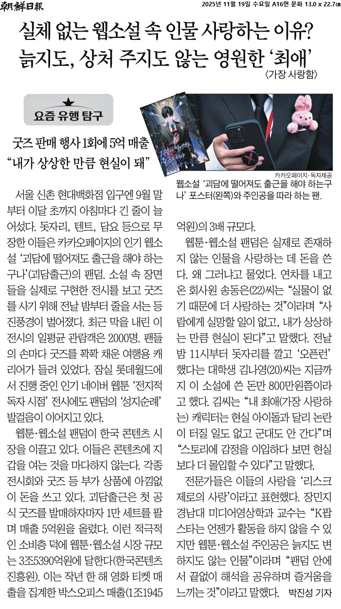 ⑤ 전문가들은 이들의 사랑을 ‘리스크 제로의 사랑’이라고 표현했다. 불확실성을 피하고 예측 가능한 것을 추구하는 Z세대의 콘텐츠 사랑 문법이라는 것이다. 장민지 경남대 미디어영상학과 교수는 “K팝 스타는 언젠가 활동을 하지 않을 수 있지만 웹툰·웹소설 주인공은 늙지도 변하지도 않는 인물”이라며 “서사에 몰입하고 팬덤 안에서 끝없이 해석을 공유하고 세계관 속에서 함께 살아 숨 쉬는 것에서 즐거움을 느끼는 것”이라고 말했다.
