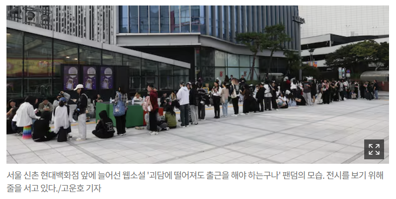① 서울 신촌 현대백화점 입구엔 9월 말부터 이달 초까지 아침마다 긴 줄이 늘어섰다. 돗자리, 텐트, 담요 등으로 무장한 이들은 카카오페이지의 인기 웹소설 ‘괴담에 떨어져도 출근을 해야 하는구나’(괴담출근)의 팬덤. 소설 속 장면들을 실제로 구현한 전시를 보고 굿즈를 사기 위해 전날 밤부터 줄을 서는 등 진풍경이 벌어졌다. 최근 막을 내린 이 전시의 일평균 관람객은 2000명.
