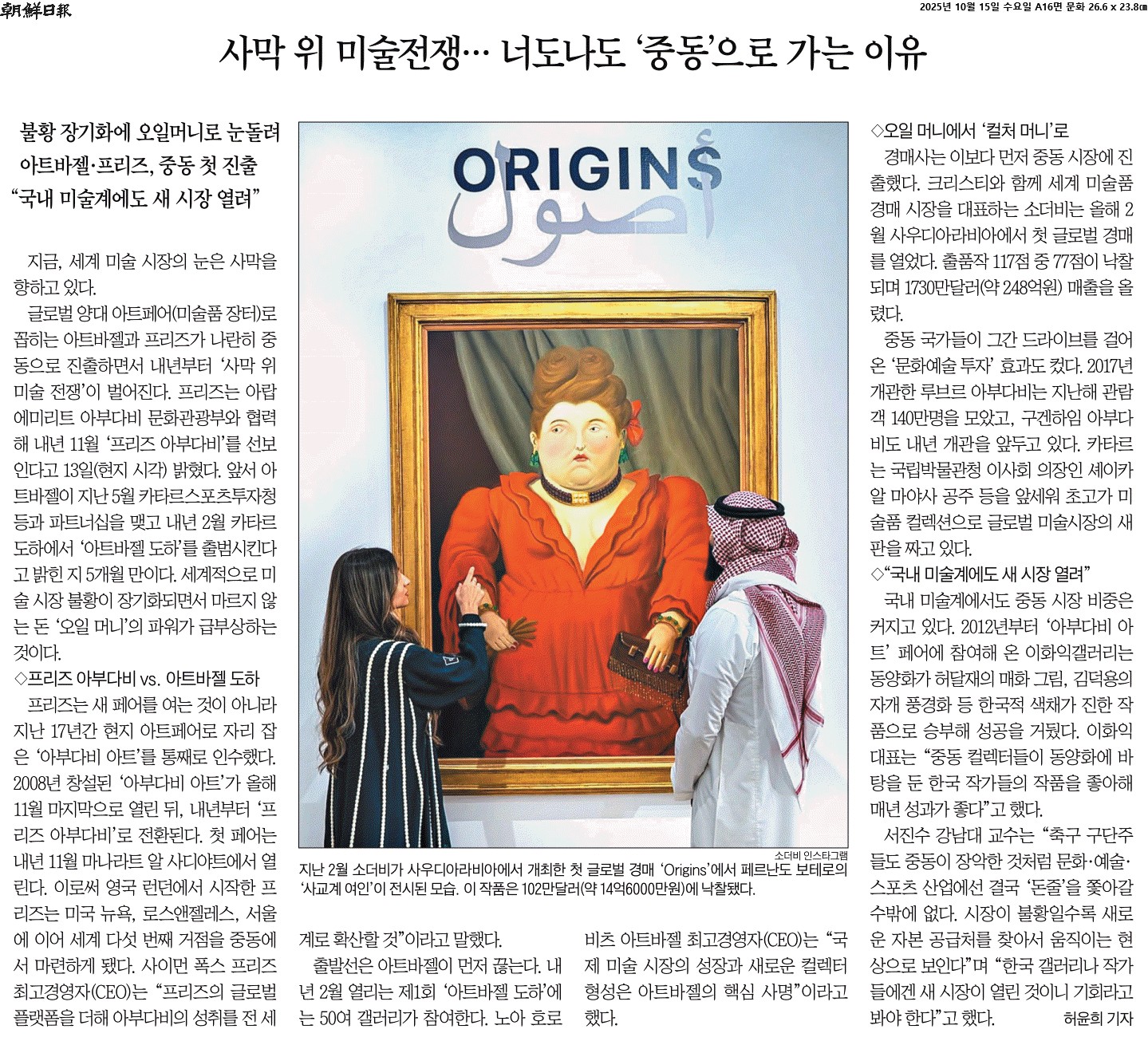 중동 국가들이 그간 드라이브를 걸어온 ‘문화예술 투자’ 효과도 컸다. 2017년 개관한 루브르 아부다비는 지난해 관람객 140만명을 모았고, 구겐하임 아부다비도 내년 개관을 앞두고 있다. 두바이는 페로탕 같은 서구 메가 갤러리가 입성한 데 이어 20년간 두바이 아트페어를 이어왔다. 카타르는 국립박물관청 이사회 의장인 셰이카 알 마야사 공주 등을 앞세워 초고가 미술품 컬렉션으로 글로벌 미술시장의 새 판을 짜고 있다.