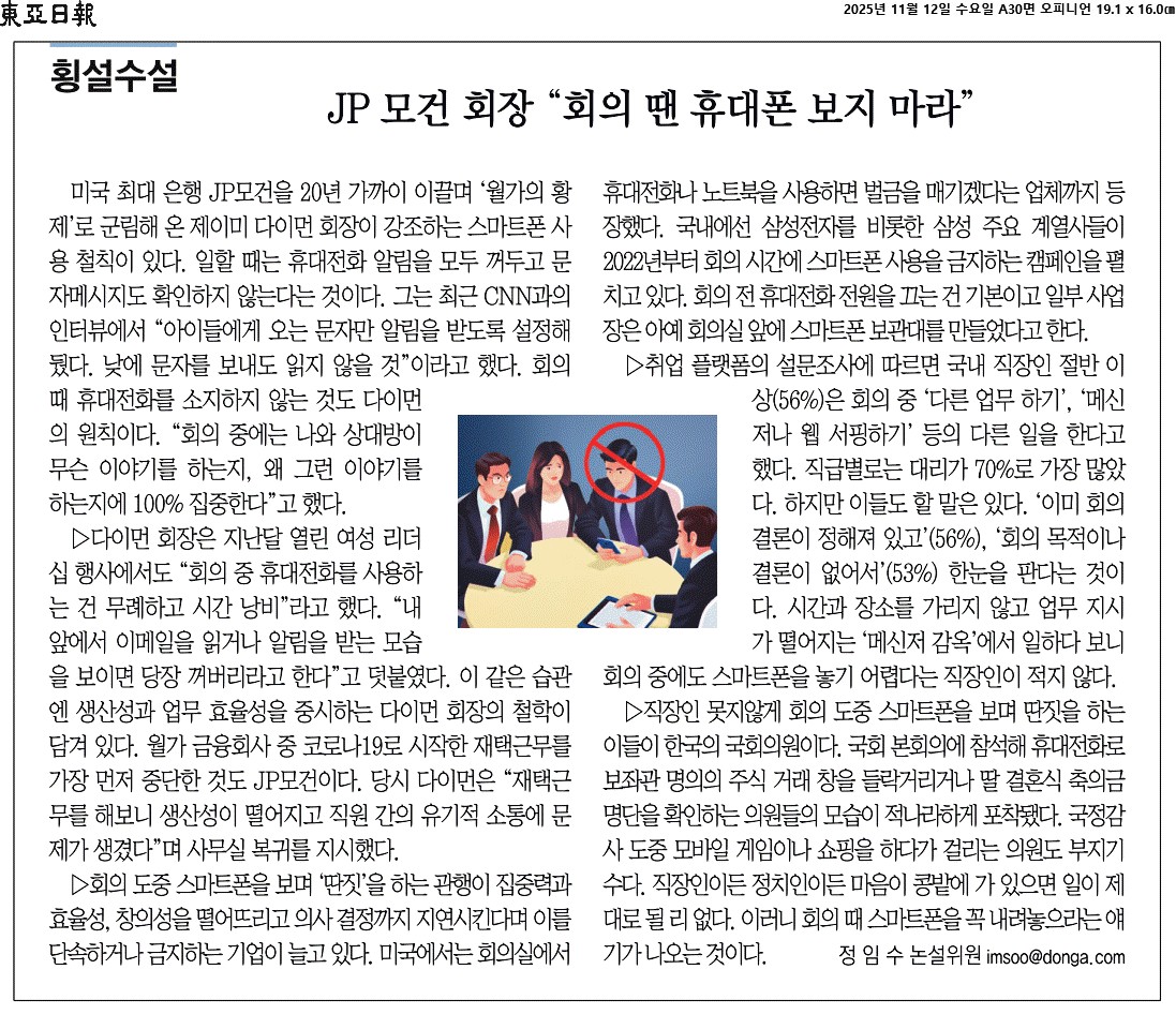 ③ 회의 도중 스마트폰을 보며 ‘딴짓’을 하는 관행이 집중력과 효율성, 창의성을 떨어뜨리고 의사 결정까지 지연시킨다며 이를 단속하거나 금지하는 기업이 늘고 있다. 미국에서는 회의실에서 휴대전화나 노트북을 사용하면 벌금을 매기겠다는 업체까지 등장했다.