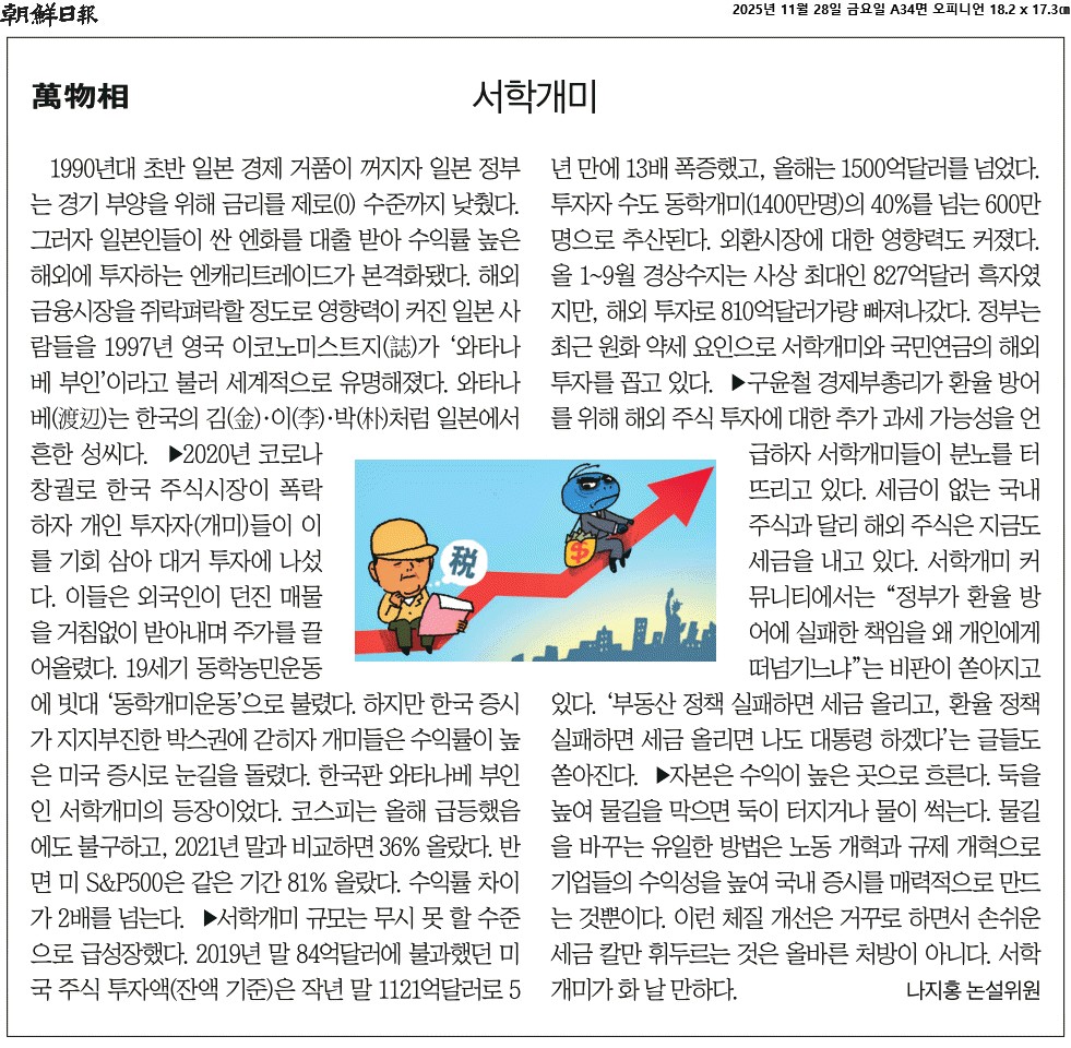 ② 2020년 코로나 창궐로 한국 주식시장이 폭락하자 개인 투자자(개미)들이 이를 기회 삼아 대거 투자에 나섰다. 이들은 외국인이 던진 매물을 거침없이 받아내며 주가를 끌어올렸다. 19세기 동학농민운동에 빗대 ‘동학개미운동’으로 불렸다. 하지만 한국 증시가 지지부진한 박스권에 갇히자 개미들은 수익률이 높은 미국 증시로 눈길을 돌렸다. 한국판 와타나베 부인인 서학개미의 등장이었다.