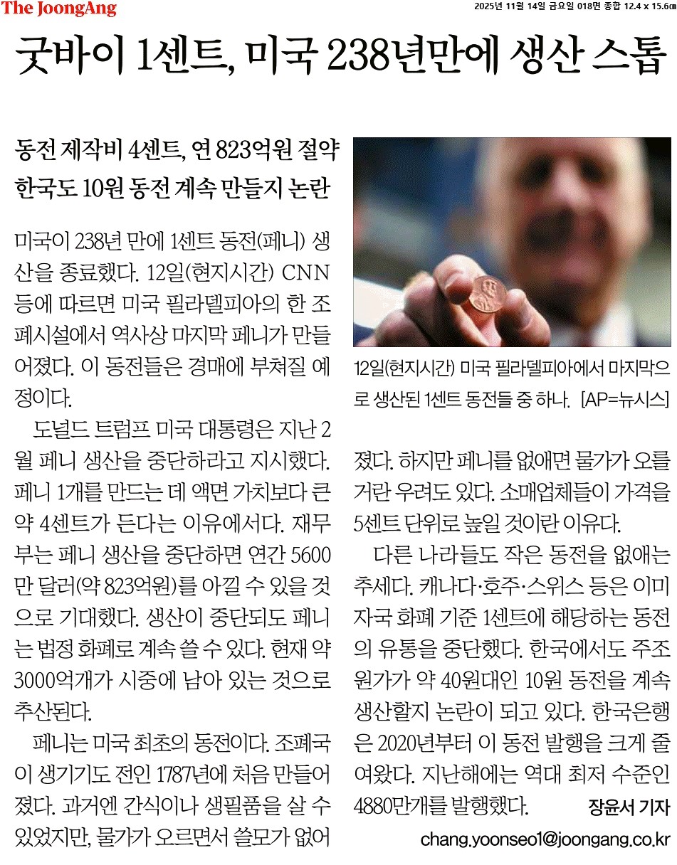 ② 도널드 트럼프 미국 대통령은 지난 2월 페니 생산을 중단하라고 지시했다. 페니 1개를 만드는 데 액면 가치보다 큰 약 4센트가 든다는 이유에서다. 재무부는 페니 생산을 중단하면 연간 5600만 달러(약 823억원)를 아낄 수 있을 것으로 기대했다. 생산이 중단되도 페니는 법정 화폐로 계속 쓸 수 있다. 현재 약 3000억개가 시중에 남아 있는 것으로 추산된다.