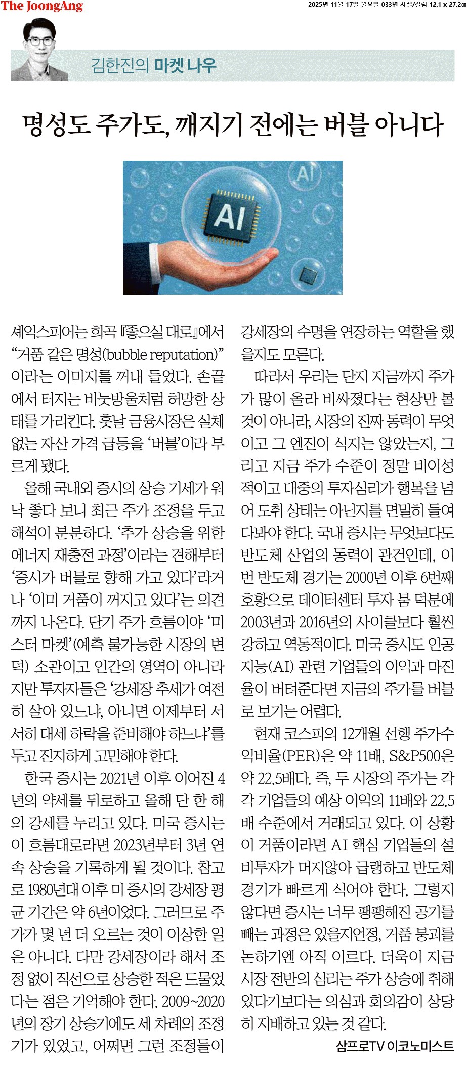 ⑤ 이 상황이 거품이라면 AI 핵심 기업들의 설비투자가 머지않아 급랭하고 반도체 경기가 빠르게 식어야 한다. 그렇지 않다면 증시는 너무 팽팽해진 공기를 빼는 과정은 있을지언정, 거품 붕괴를 논하기엔 아직 이르다. 더욱이 지금 시장 전반의 심리는 주가 상승에 취해 있다기보다는 의심과 회의감이 상당히 지배하고 있는 것 같다.