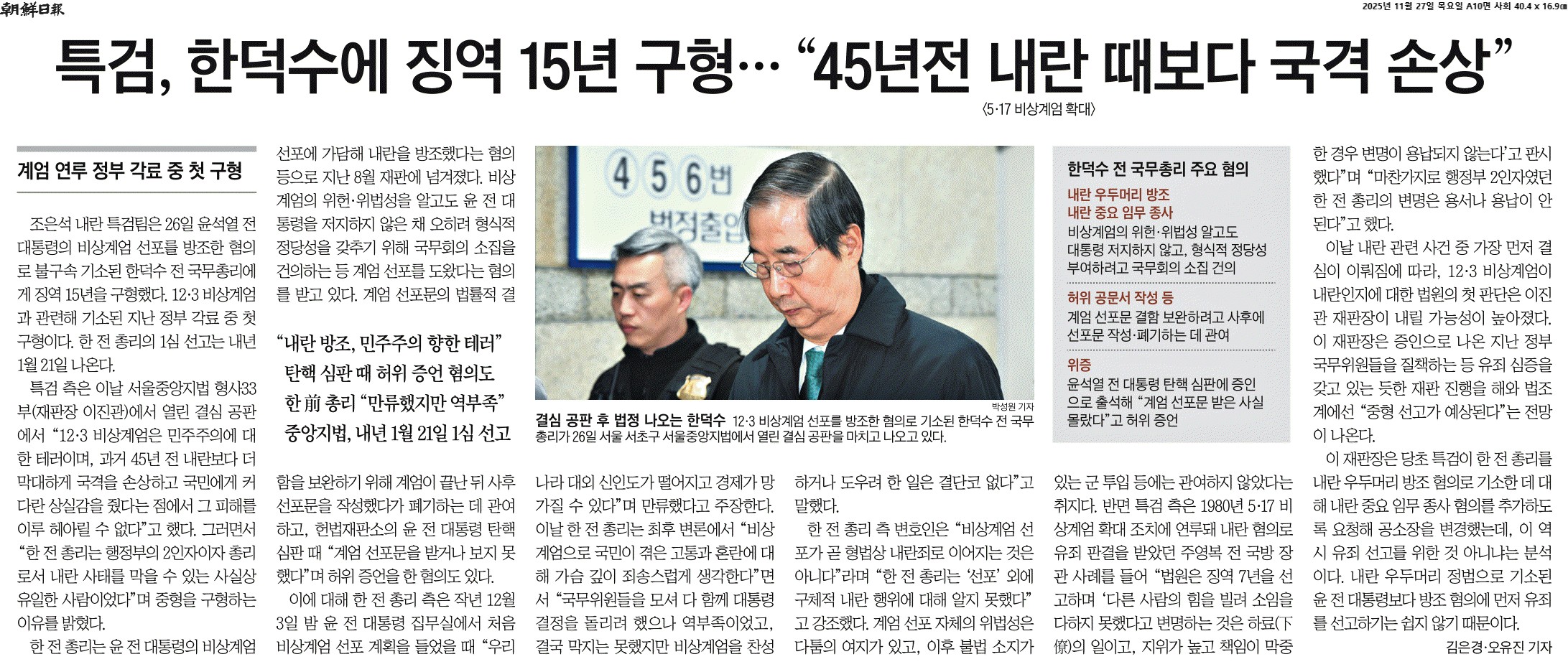 ② 특검 측은 26일 서울중앙지법 형사33부(재판장 이진관)에서 열린 결심 공판에서 “12·3 비상계엄은 민주주의에 대한 테러”라며 “과거 45년 전 내란보다 더 막대하게 국격을 손상하고 국민에게 커다란 상실감을 줬다는 점에서 그 피해를 이루 헤아릴 수 없고 가늠하기도 어렵다”고 했다. 이어 “한 전 총리는 행정부의 2인자이자 총리로서 내란 사태를 막을 수 있는 사실상 유일한 사람이었다”며 구형 의견을 밝혔다.