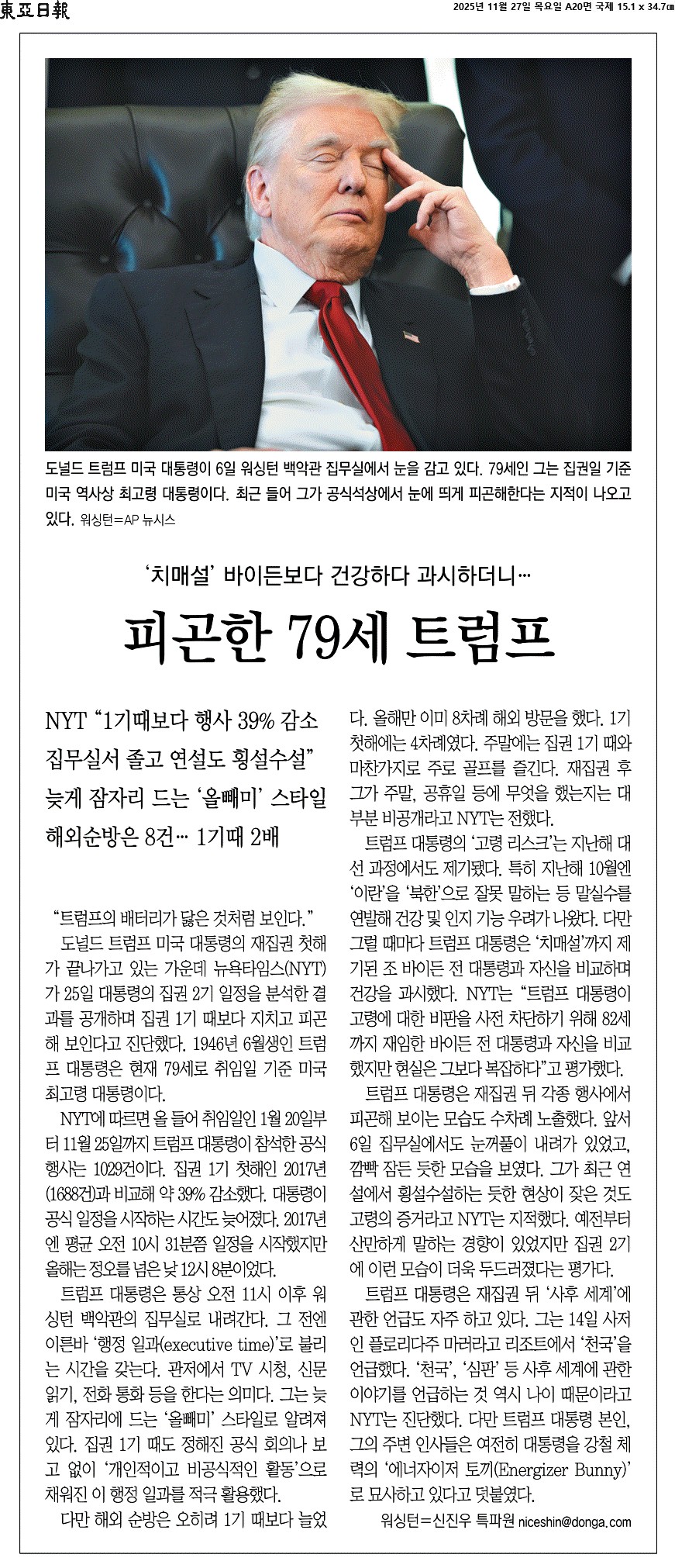 도널드 트럼프 미국 대통령의 재집권 첫해가 끝나가고 있는 가운데 뉴욕타임스(NYT)가 25일 대통령의 집권 2기 일정을 분석한 결과를 공개하며 집권 1기 때보다 지치고 피곤해 보인다고 진단했다. 1946년 6월생인 트럼프 대통령은 현재 79세로 취임일 기준 미국 최고령 대통령이다.