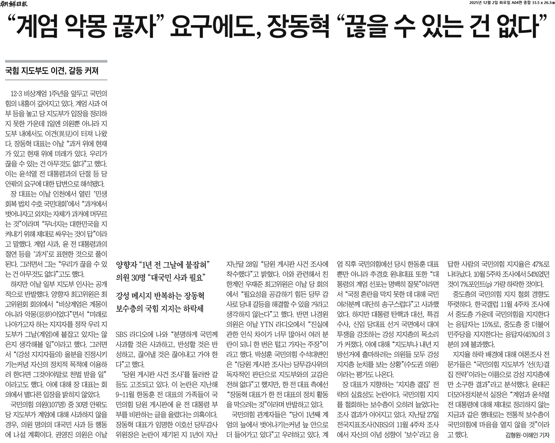 ① 12·3 비상계엄 1주년을 앞두고 국민의힘의 내홍이 깊어지고 있다. 계엄 사과 여부 등을 놓고 당 지도부가 입장을 정리하지 못한 가운데 1일엔 의원뿐 아니라 지도부 내에서도 이견(異見)이 터져 나왔다. 장동혁 대표는 이날 “과거 위에 현재가 있고 현재 위에 미래가 있다. 우리가 끊을 수 있는 건 아무것도 없다”고 했다. 이는 윤석열 전 대통령과의 단절 등 당 안팎의 요구에 대한 답변으로 해석됐다.