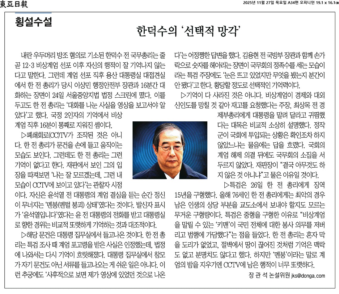 ② 폐쇄회로(CC)TV가 조작된 것은 아니다. 한 전 총리가 문건을 손에 들고 움직이는 모습도 보인다. 그런데도 한 전 총리는 그런 기억이 없다고 한다. 재판에서 보인 그의 입장을 따져보면 ‘나는 잘 모르겠는데, 그런 내 모습이 CCTV에 보이고 있다’는 관찰자 시점이다. 자신은 윤석열 전 대통령의 계엄 결심을 듣는 순간 정신이 무너지는 ‘멘붕(멘털 붕괴) 상태’였다는 것이다.