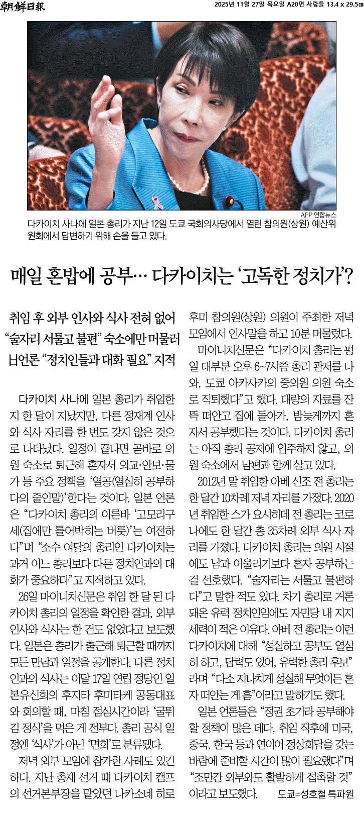 ② 26일 마이니치신문은 취임 한 달 된 다카이치 총리의 일정을 확인한 결과, 외부 인사와 식사는 한 건도 없었다고 보도했다. 일본은 총리가 출근해 퇴근할 때까지 모든 만남과 일정을 공개한다. 다른 정치인과의 식사는 이달 17일 연립 정당인 일본유신회의 후지타 후미타케 공동대표와 회의할 때, 마침 점심시간이라 '굴튀김 정식'을 먹은 게 전부다. 총리 공식 일정엔 '식사'가 아닌 '면회'로 분류됐다.