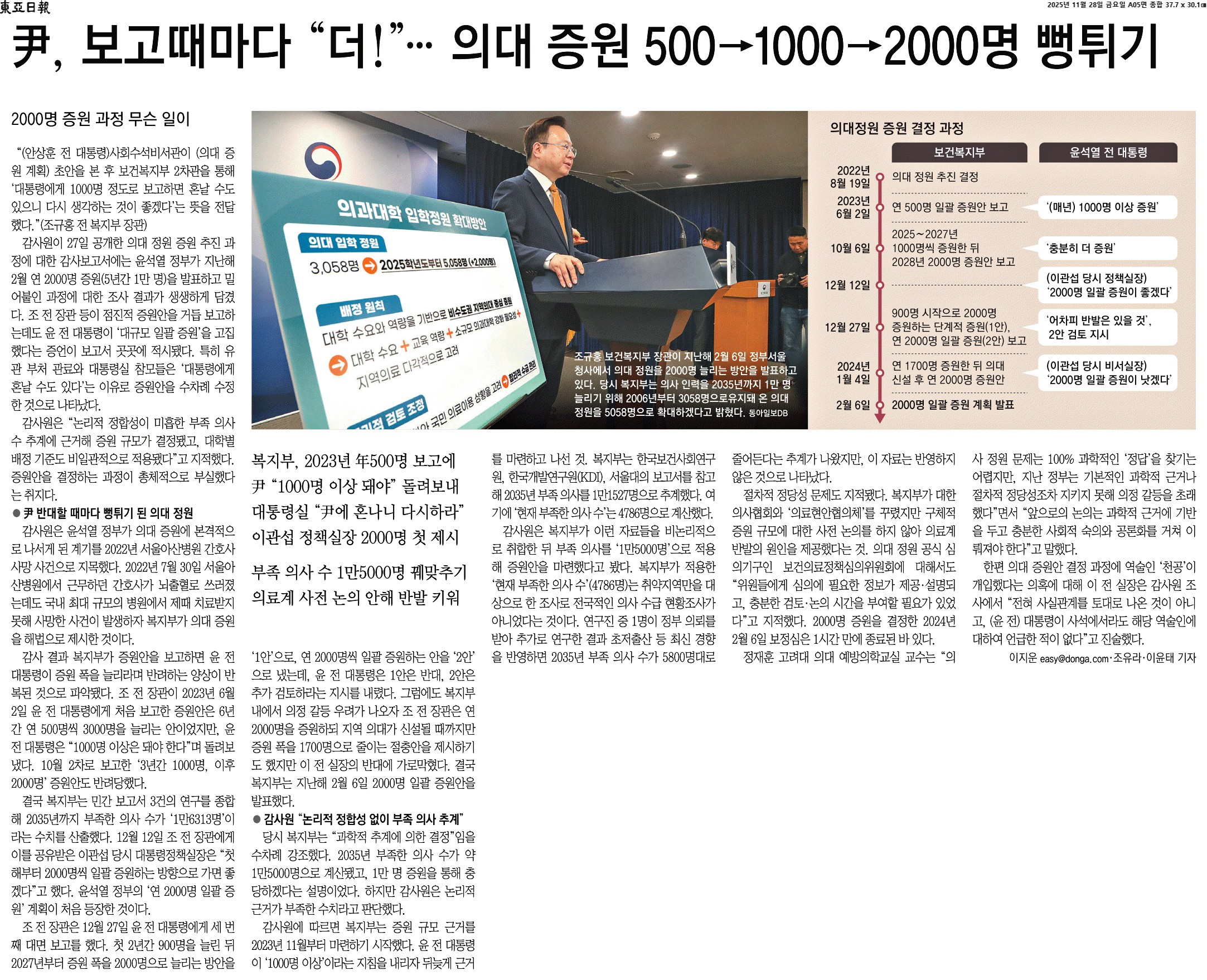 ④ 당시 복지부는 “과학적 추계에 의한 결정”임을 수차례 강조했다. 2035년 부족한 의사 수가 약 1만5000명으로 계산됐고, 1만 명 증원을 통해 충당하겠다는 설명이었다. 하지만 감사원은 논리적 근거가 부족한 수치라고 판단했다.