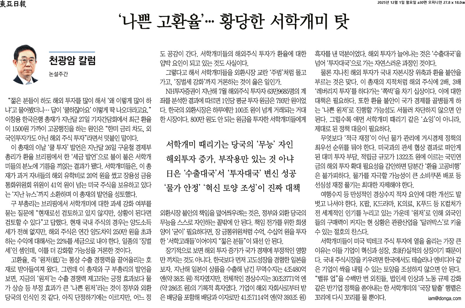 ② 이 총재의 이날 ‘쿨 투자’ 발언은 지난달 26일 구윤철 경제부총리가 환율 브리핑에서 한 ‘세금 발언’으로 불이 붙은 서학개미들의 분노에 기름을 끼얹는 결과가 됐다. 서학개미들은, 이 총재가 과거 자녀들의 해외 유학비로 20억 원을 썼고 장용성 금융통화위원회 위원이 41억 원이 넘는 미국 주식을 보유하고 있다는 ‘지난 뉴스’까지 소환하며 이 총재의 발언을 성토했다.
