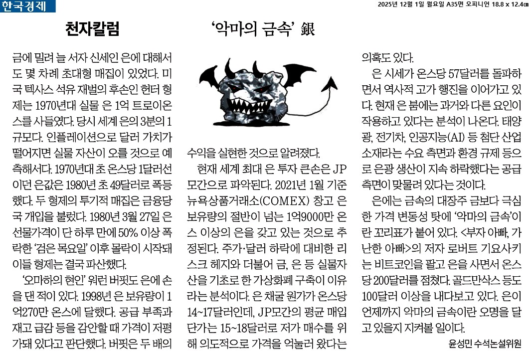 ③ 현재 세계 최대 은 투자 큰손은 JP모간으로 파악된다. 2021년 1월 기준 뉴욕상품거래소(COMEX) 창고 은 보유량의 절반이 넘는 1억9000만 온스 이상의 은을 갖고 있는 것으로 추정된다. 주가·달러 하락에 대비한 리스크 헤지와 더불어 금, 은 등 실물자산을 기초로 한 가상화폐 구축이 이유라는 분석이다.