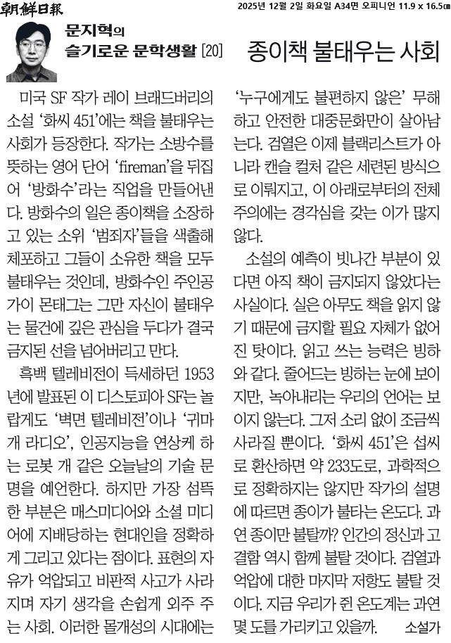 ⑤ 읽고 쓰는 능력은 빙하와 같다. 줄어드는 빙하는 눈에 보이지만, 녹아내리는 우리의 언어는 보이지 않는다. 그저 소리 없이 조금씩 사라질 뿐이다. ‘화씨 451’은 섭씨로 환산하면 약 233도로, 과학적으로 정확하지는 않지만 작가의 설명에 따르면 종이가 불타는 온도다. 과연 종이만 불탈까? 인간의 정신과 고결함 역시 함께 불탈 것이다.
