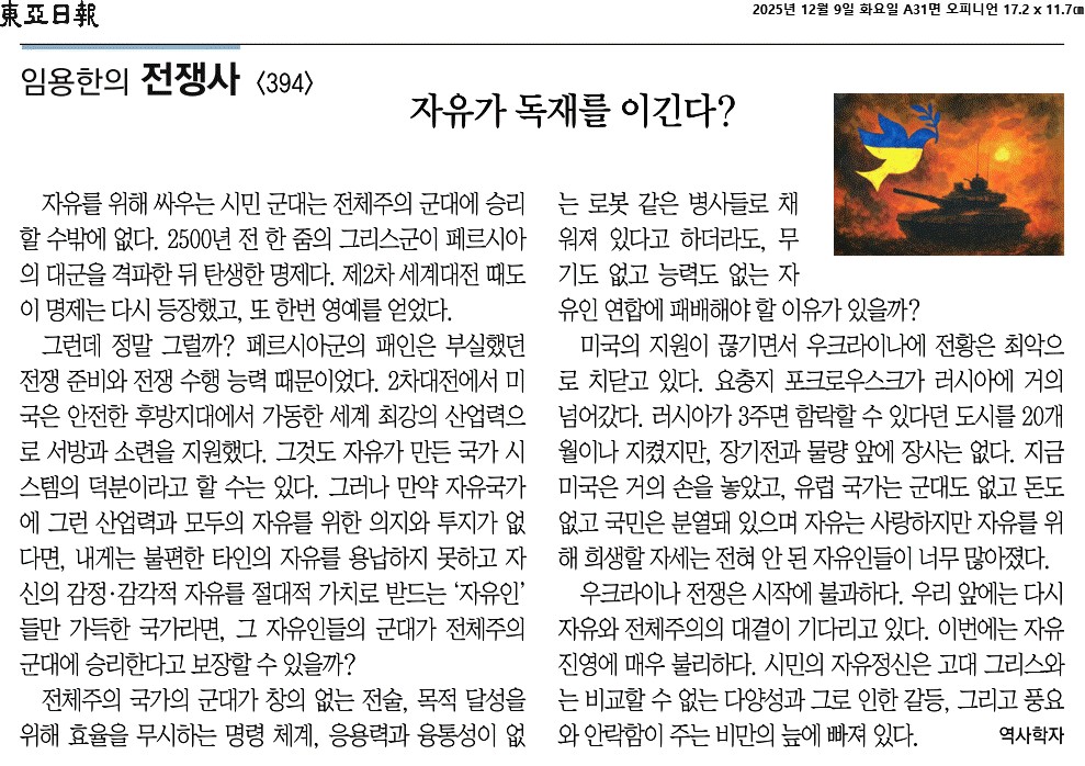 ② 그런데 정말 그럴까? 페르시아군의 패인은 부실했던 전쟁 준비와 전쟁 수행 능력 때문이었다. 2차대전에서 미국은 안전한 후방지대에서 가동한 세계 최강의 산업력으로 서방과 소련을 지원했다. 그것도 자유가 만든 국가 시스템의 덕분이라고 할 수는 있다. 그러나 만약 자유국가에 그런 산업력과 모두의 자유를 위한 의지와 투지가 없다면, 내게는 불편한 타인의 자유를 용납하지 못하고 자신의 감정·감각적 자유를 절대적 가치로 받드는 ‘자유인’들만 가득한 국가라면, 그 자유인들의 군대가 전체주의 군대에 승리한다고 보장할 수 있을까?