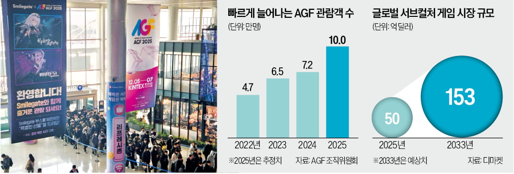② AGF 조직위원회에 따르면 올해 관람객은 10만 명에 달한 것으로 추정된다. 2022년 4만7777명, 2023년 6만5442명, 지난해 7만2081명으로 매년 역대 기록을 갈아치우는 중이다. 국내 대표 게임 전시회인 지스타의 올해 관람객이 전년 대비 10%가량 줄며 성장세가 둔화한 것과는 대비되는 흐름이다.