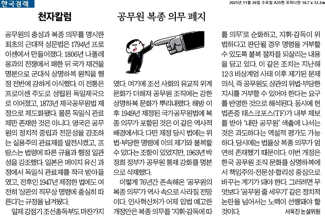 ④ 이렇게 76년간 존속해온 ‘공무원의 복종 의무’가 역사 속으로 사라질 전망이다. 인사혁신처가 어제 입법 예고한 개정안은 복종 의무를 ‘지휘·감독에 따를 의무’로 순화하고, 지휘·감독이 위법하다고 판단될 경우 명령을 거부할 수 있도록 불복 절차를 되살리는 내용을 담고 있다. 이 같은 조치는 지난해 12·3 비상계엄 사태 이후 제기된 문제의식, 즉 공무원도 상관의 위법·부당한 지시를 거부할 수 있어야 한다는 요구를 반영한 것으로 해석된다.
