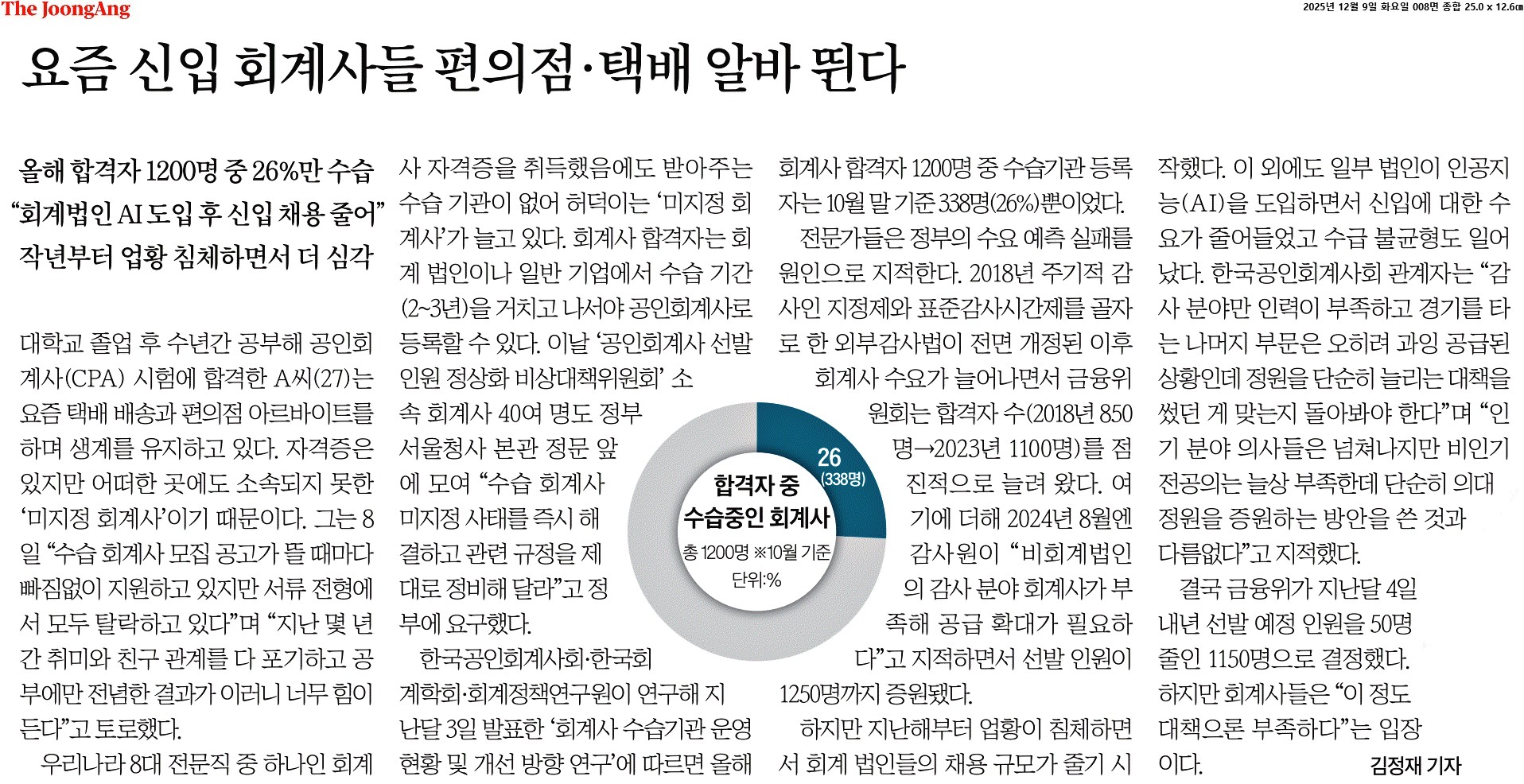 ③ 한국공인회계사회·한국회계학회·회계정책연구원이 연구해 지난달 3일 발표한 ‘회계사 수습기관 운영 현황 및 개선 방향 연구’에 따르면 올해 회계사 합격자 1200명 중 수습기관 등록자는 10월 말 기준 338명(26%)뿐이었다.