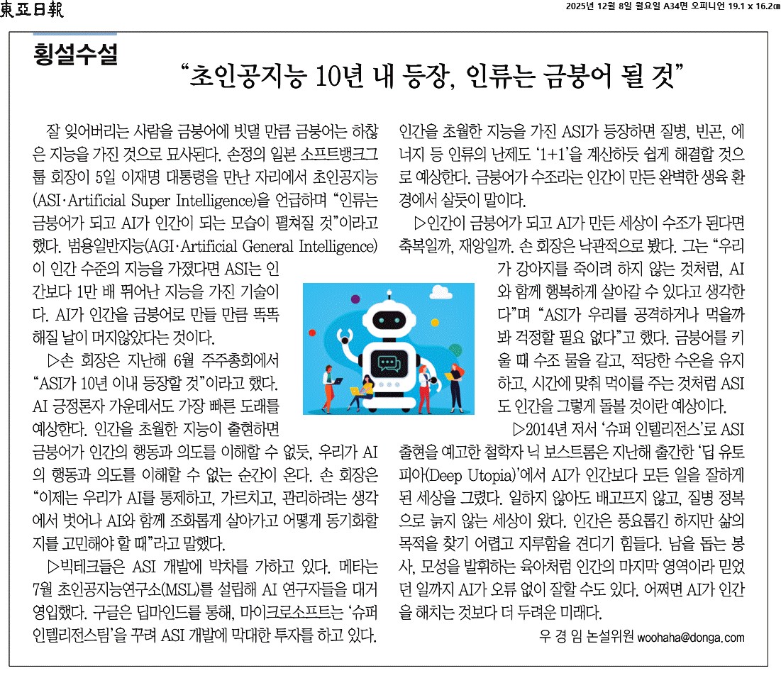 ① 손정의 일본 소프트뱅크그룹 회장이 5일 이재명 대통령을 만난 자리에서 초인공지능(ASI·Artificial Super Intelligence)을 언급하며 “인류는 금붕어가 되고 AI가 인간이 되는 모습이 펼쳐질 것”이라고 했다. 범용일반지능(AGI·Artificial General Intelligence)이 인간 수준의 지능을 가졌다면 ASI는 인간보다 1만 배 뛰어난 지능을 가진 기술이다. AI가 인간을 금붕어로 만들 만큼 똑똑해질 날이 머지않았다는 것이다.