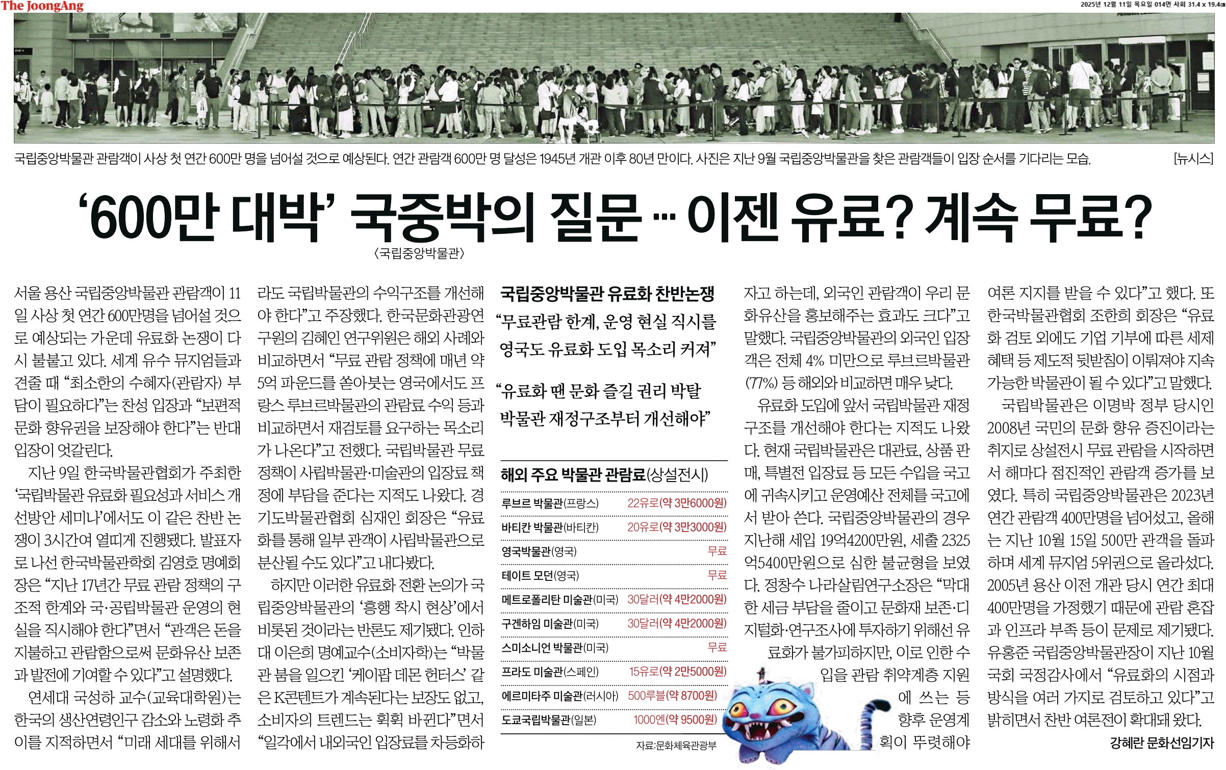 ④ 하지만 이러한 유료화 전환 논의가 국립중앙박물관의 ‘흥행 착시 현상’에서 비롯된 것이라는 반론도 제기됐다. 인하대 이은희 명예교수(소비자학)는 “박물관 붐을 일으킨 ‘케이팝 데몬 헌터스’ 같은 K콘텐트가 계속된다는 보장도 없고, 소비자의 트렌드는 휙휙 바뀐다”면서 “일각에서 내외국인 입장료를 차등화하자고 하는데, 외국인 관람객이 우리 문화유산을 홍보해주는 효과도 크다”고 말했다. 국립중앙박물관의 외국인 입장객은 전체 4% 미만으로 루브르박물관(77%) 등 해외와 비교하면 매우 낮다.