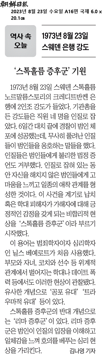 ① 1973년 스웨덴 스톡홀름의 은행에 2인조 강도가 들었다.