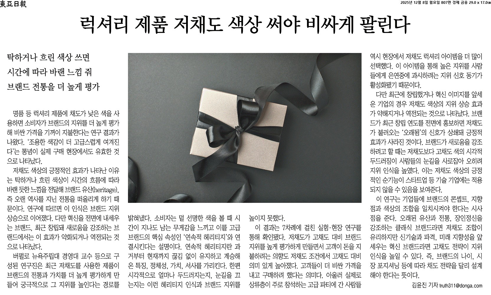 ③ 소비자는 덜 선명한 색을 볼 때 시간이 지나도 남는 무게감을 느끼고 이를 고급 브랜드의 핵심 속성인 ‘연속적 헤리티지’와 연결시킨다는 설명이다. 연속적 헤리티지란 과거부터 현재까지 끊김 없이 유지하고 계승해온 특징, 정체성, 가치, 서사를 가리킨다. 한편 시각적으로 얼마나 두드러지는지, 눈길을 끄는지는 이런 헤리티지 인식과 브랜드 지위를 높이지 못했다.