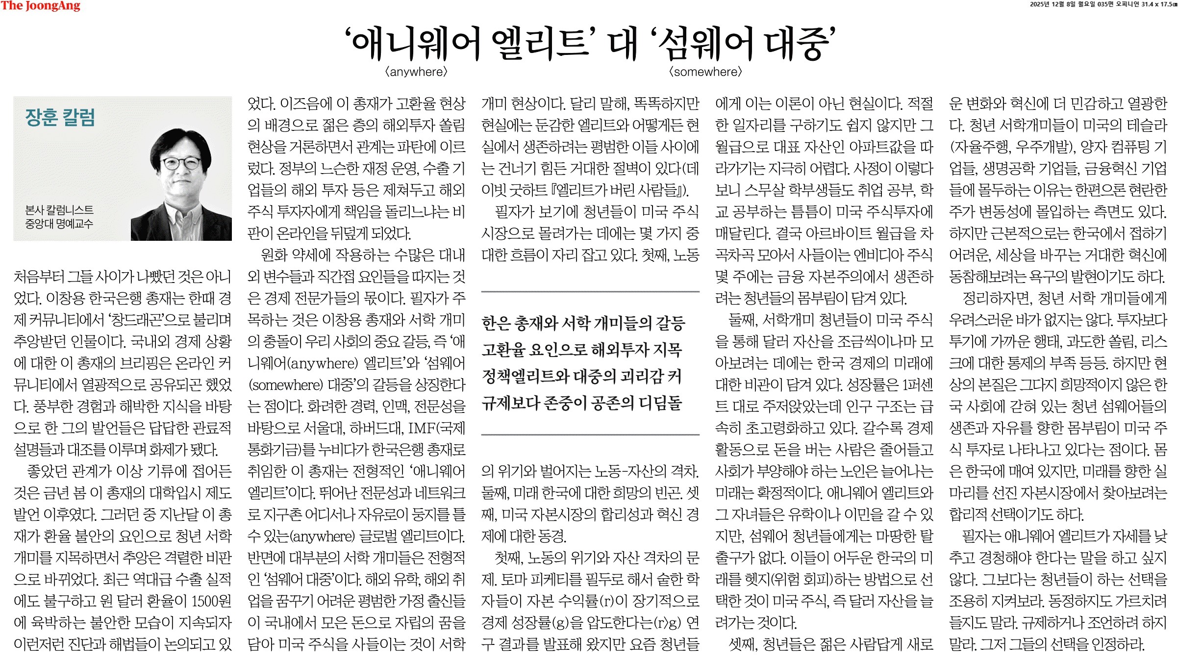 ③ 필자가 주목하는 것은 이창용 총재와 서학 개미의 충돌이 우리 사회의 중요 갈등, 즉 ‘애니웨어(anywhere) 엘리트’와 ‘섬웨어(somewhere) 대중’의 갈등을 상징한다는 점이다. 화려한 경력, 인맥, 전문성을 바탕으로 서울대, 하버드대, IMF(국제통화기금)를 누비다가 한국은행 총재로 취임한 이 총재는 전형적인 ‘애니웨어 엘리트’이다. 뛰어난 전문성과 네트워크로 지구촌 어디서나 자유로이 둥지를 틀 수 있는(anywhere) 글로벌 엘리트이다. 반면에 대부분의 서학 개미들은 전형적인 ‘섬웨어 대중’이다. 해외 유학, 해외 취업을 꿈꾸기 어려운 평범한 가정 출신들이 국내에서 모은 돈으로 자립의 꿈을 담아 미국 주식을 사들이는 것이 서학 개미 현상이다. 달리 말해, 똑똑하지만 현실에는 둔감한 엘리트와 어떻게든 현실에서 생존하려는 평범한 이들 사이에는 건너기 힘든 거대한 절벽이 있다(데이빗 굿하트 『엘리트가 버린 사람들』).