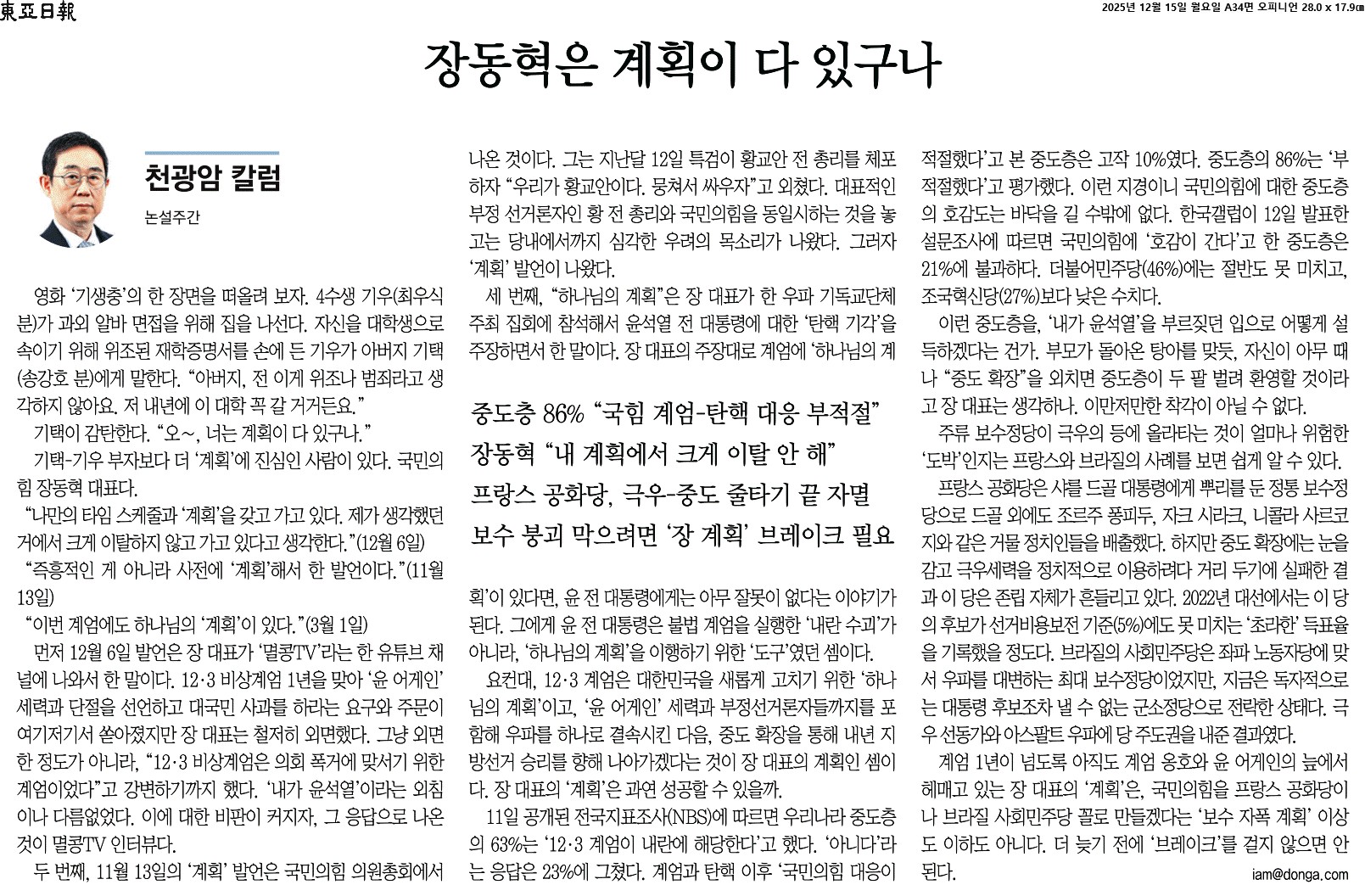 ③ 요컨대, 12·3 계엄은 대한민국을 새롭게 고치기 위한 ‘하나님의 계획’이고, ‘윤 어게인’ 세력과 부정선거론자들까지를 포함해 우파를 하나로 결속시킨 다음, 중도 확장을 통해 내년 지방선거 승리를 향해 나아가겠다는 것이 장 대표의 계획인 셈이다. 장 대표의 ‘계획’은 과연 성공할 수 있을까.