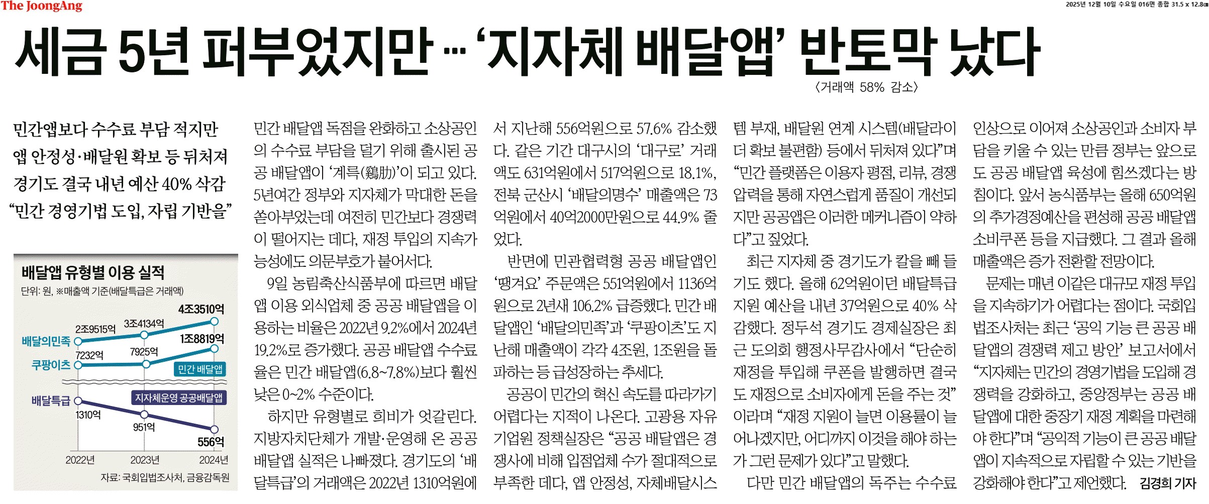 ① 민간 배달앱 독점을 완화하고 소상공인의 수수료 부담을 덜기 위해 출시된 공공 배달앱이 ‘계륵(鷄肋)’이 되고 있다. 5년여간 정부와 지자체가 막대한 돈을 쏟아부었는데 여전히 민간보다 경쟁력이 떨어지는 데다, 재정 투입의 지속가능성에도 의문부호가 붙어서다.
