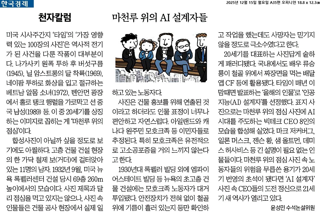 ⑤ 마크 저커버그, 일론 머스크, 젠슨 황, 샘 올트먼, 데미스 허사비스 등 긴 설명이 필요 없는 인물들이다. 마천루 위의 점심 사진 속 노동자들의 위험을 무릅쓴 용기가 20세기 번영의 초석이 됐다면 ‘AI 설계자’ 사진 속 CEO들의 도전 정신으로 21세기 새 역사가 열리고 있다.
