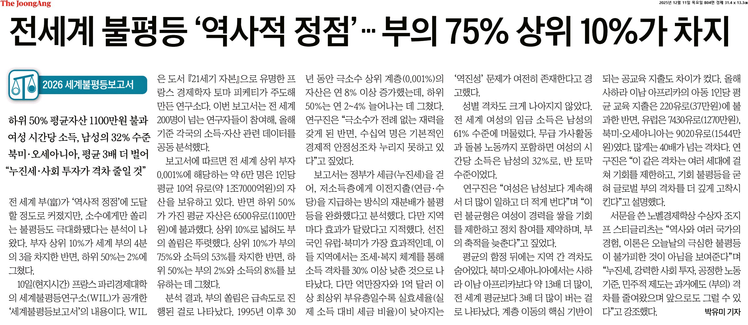 ① 전 세계 부(富)가 ‘역사적 정점’에 도달할 정도로 커졌지만, 소수에게만 쏠리는 불평등도 극대화됐다는 분석이 나왔다. 부자 상위 10%가 세계 부의 4분의 3을 차지한 반면, 하위 50%는 2%에 그쳤다. 10일(현지시간) 프랑스 파리경제대학의 세계불평등연구소(WIL)가 공개한 ‘2026 세계불평등보고서’의 내용이다. WIL은 도서 ‘21세기 자본’으로 유명한 프랑스 경제학자 토마 피케티가 주도해 만든 연구소다. 이번 보고서는 전 세계 200명 넘는 연구자들이 참여해, 올해 기준 각국의 소득ㆍ자산 관련 데이터를 공동 분석했다.