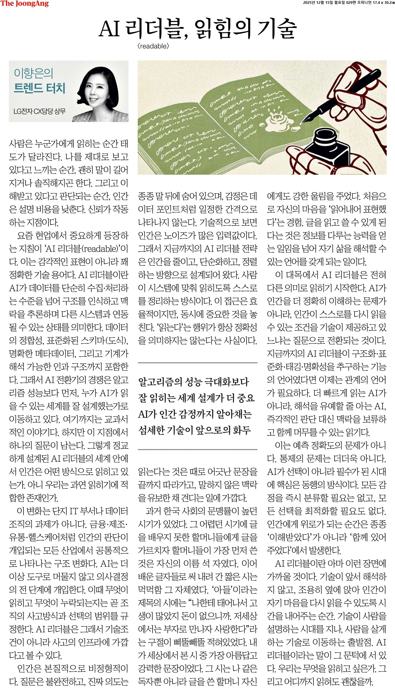 ⑤ AI 리더블이란 아마 이런 장면에 가까울 것이다. 기술이 앞서 해석하지 않고, 조용히 옆에 앉아 인간이 자기 마음을 다시 읽을 수 있도록 시간을 내어주는 순간. 기술이 사람을 설명하는 시대를 지나, 사람을 살게 하는 기술로 이동하는 출발점. AI 리더블이라는 말이 그 문턱에 서 있다. 우리는 무엇을 읽히고 싶은가. 그리고 어디까지 읽혀도 괜찮을까.