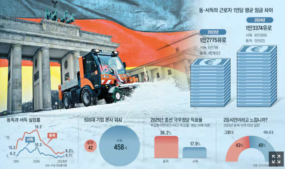 ④ 독일 연방통계청에 따르면, 동·서독 간 근로자 1인당 평균 임금 차이는 2023년 1만2775유로에서 2024년 1만3374유로(약 2300만원)로 더 커졌다. 지난해 서독 근로자가 6만3999유로를 벌 때 동독 근로자는 5만625유로를 벌었다. 월급쟁이 소득으로 동독이 서독의 79%에 그친다는 얘기다. 실업률은 동독 지역 8.2%, 서독 지역 6.1%다.