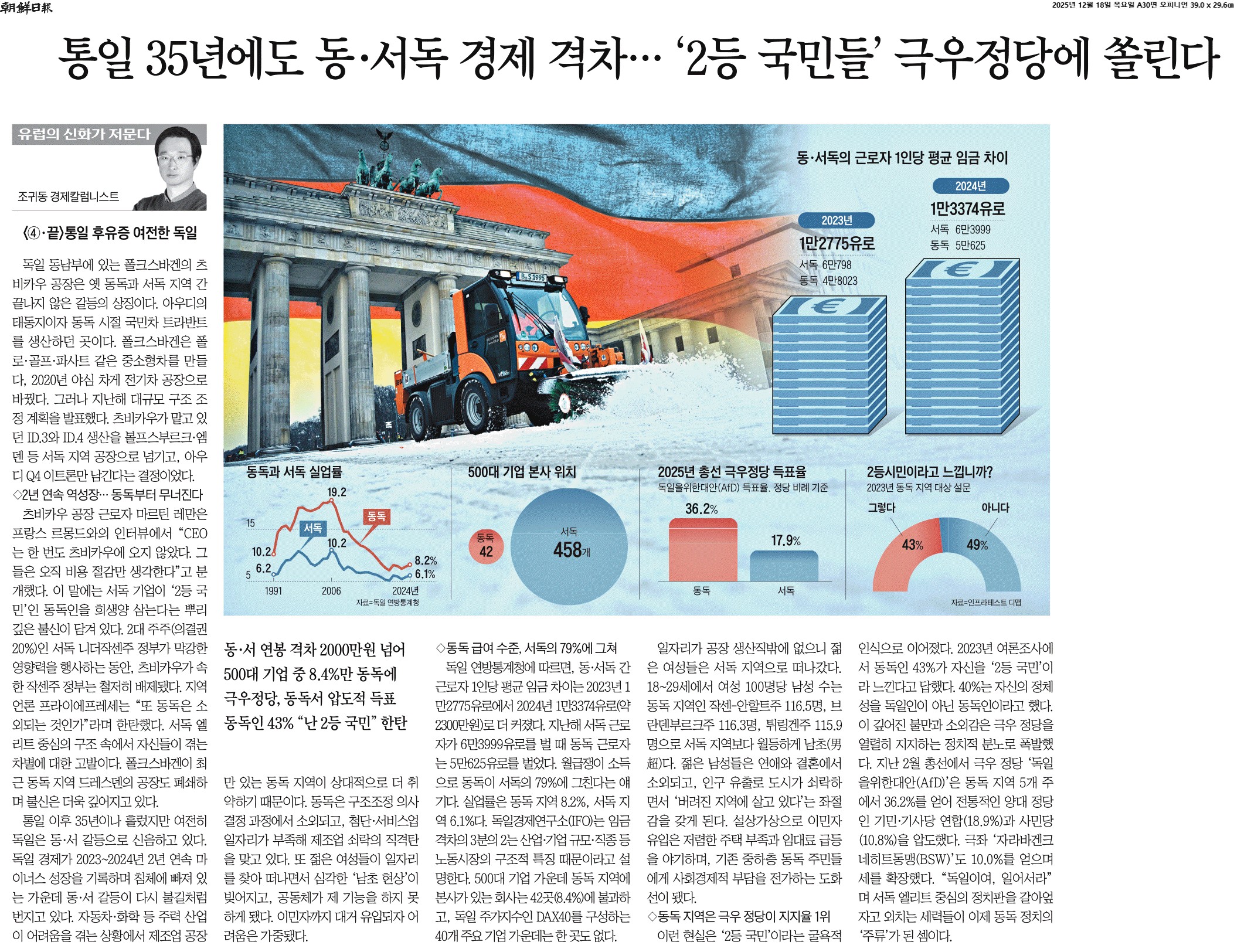 ③ 통일 이후 35년이나 흘렀지만 여전히 독일은 동·서 갈등으로 신음하고 있다. 독일 경제가 2023~2024년 2년 연속 마이너스 성장을 기록하며 침체에 빠져 있는 가운데 동·서 갈등이 다시 불길처럼 번지고 있다. 자동차·화학 등 주력 산업이 어려움을 겪는 상황에서 제조업 공장만 있는 동독 지역이 상대적으로 더 취약하기 때문이다. 동독은 구조조정 의사 결정 과정에서 소외되고, 첨단·서비스업 일자리가 부족해 제조업 쇠락의 직격탄을 맞고 있다. 또 젊은 여성들이 일자리를 찾아 떠나면서 심각한 ‘남초 현상’이 빚어지고, 공동체가 제 기능을 하지 못하게 됐다. 이민자까지 대거 유입되자 어려움은 가중됐다.